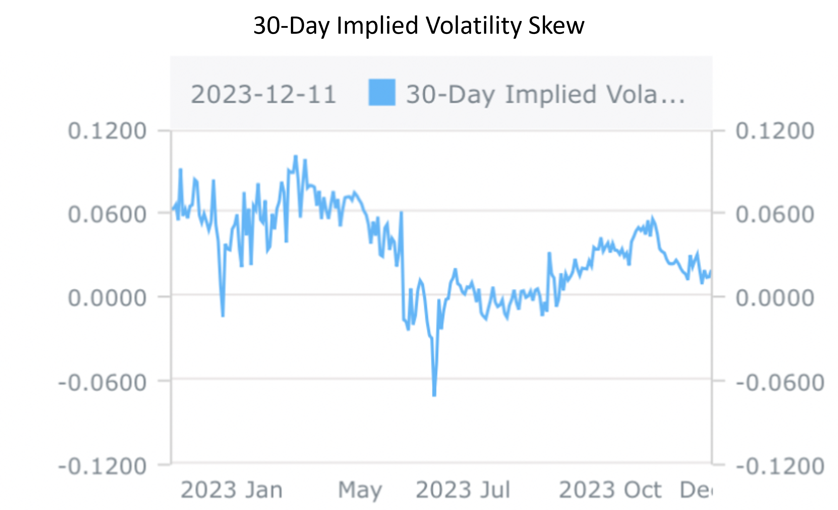 There were a few examples of this in 2023. For example, we saw this with Nvidia (NVDA) after its dramatic earnings beat and guidance that caused extreme stock chasing. We’ve also seen this play out in the pharmaceutical sector based on the recent infatuation with weight loss drugs. These shifts caused substantial elevation in implied volatility on the call side and a rare flattening in skew.