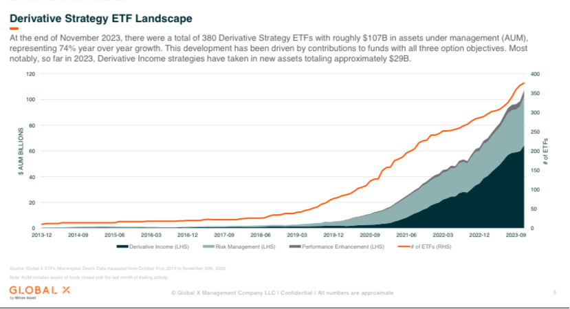 My thesis rests on the dramatic and ever-increasing listings along with notional assets under management (AUM) in the derivatives-based ETF space – as shown in the chart below.