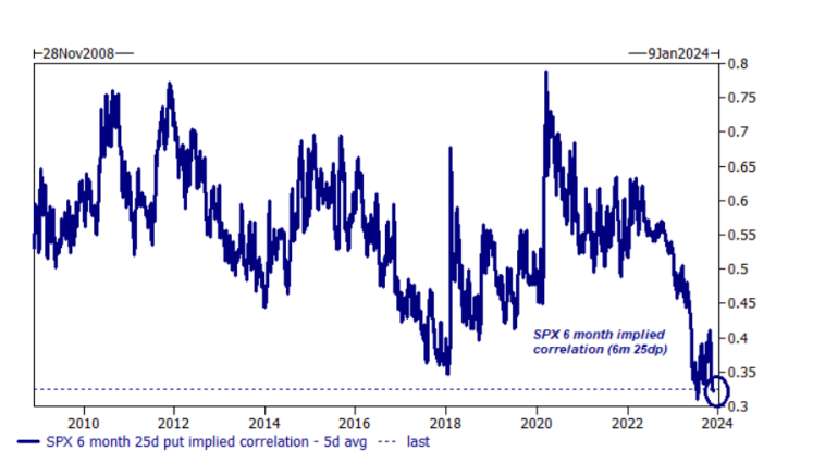 2024 will see a significant increase in equity market correlation which is a key driver of volatility. Now, as most readers will know, this is not hard to understand as we are at multi-year lows of correlation, as shown in the illustration below. Of course, this shift (of correlation going higher) can be catalyzed by a sudden shock in equity prices or an upcoming “known unknown” related to geopolitical issues or economic data.