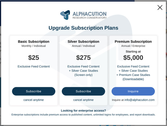 There are 3 subscription levels: Basic, Silver and Premium. The Basic subscription provides access to all restricted content on the Feed for a low monthly fee. The Silver subscription adds occasional short reports to the Basic access for a discounted annual fee. And, the all-access Premium subscription – our best value bundle designed mainly for enterprise subscribers – adds our comprehensive case studies to the Silver access (plus unlimited employee logins) for an annual fee. Pricing and primary features are summarized in the following pop-up, which you are likely to run into as you explore our site: