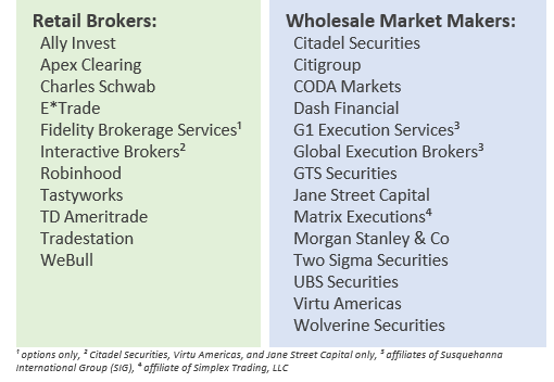Because of this key role in the market ecosystem, Alphacution wanted to take time to explore – in as much detail as is practical – the full year of PFOF data provided by the quarterly Form 606 reports filed by retail brokers before moving any further into its research agenda for case studies because we expect a deeper understanding of PFOF to be useful for the study of market macrostructure. Now, relative to Alphacution’s library of published case studies (which have typically focused on affiliated entities to a single trading firm), this one is uniquely ambitious for its scope of modeling and analysis across 11 retail brokers (comprising 12 entities) and 14 wholesale market makers (representing affiliates of 3 banks, 8 proprietary trading firms, and 2 independent agency brokers), listed as follows: