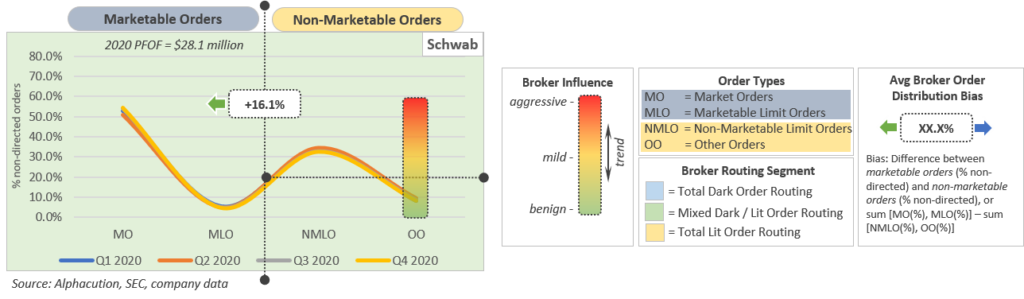 Now, a large part of broker persona results from investor demographics. Generally, older and wealthier retail investors can be detected from analytics such as larger average account sizes. Younger and beginner investors can be detected this way, as well. But investor demographics – average account sizes, average order sizes, and the like – do not explain the entire scope of broker persona. Since all – or, at least, a vast majority of – retail investors now interact with U.S. listed markets through broker-developed trading platforms, retail brokers can influence client behaviors – level of trading activity, level of trading sophistication, security selections, order type selections, etc. – via software design and educational tools. Alphacution is calling this factor broker influence; making it another key component of broker persona…