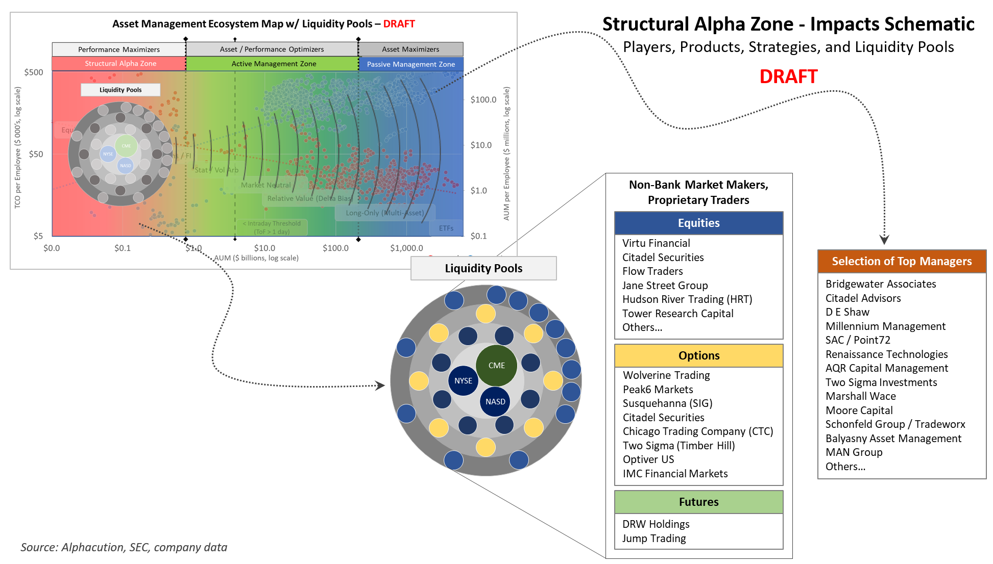 So, this brings us back to where we started. In the chart below, Alphacution presents its initial impacts schematic for the structural alpha zone, along with a representative list of the 30-40 buyside trading firms that will become the subjects and targets of a bulk of our upcoming research production: (I am keeping it in DRAFT-mode for now, allowing for inevitable iterations while the ink dries.)