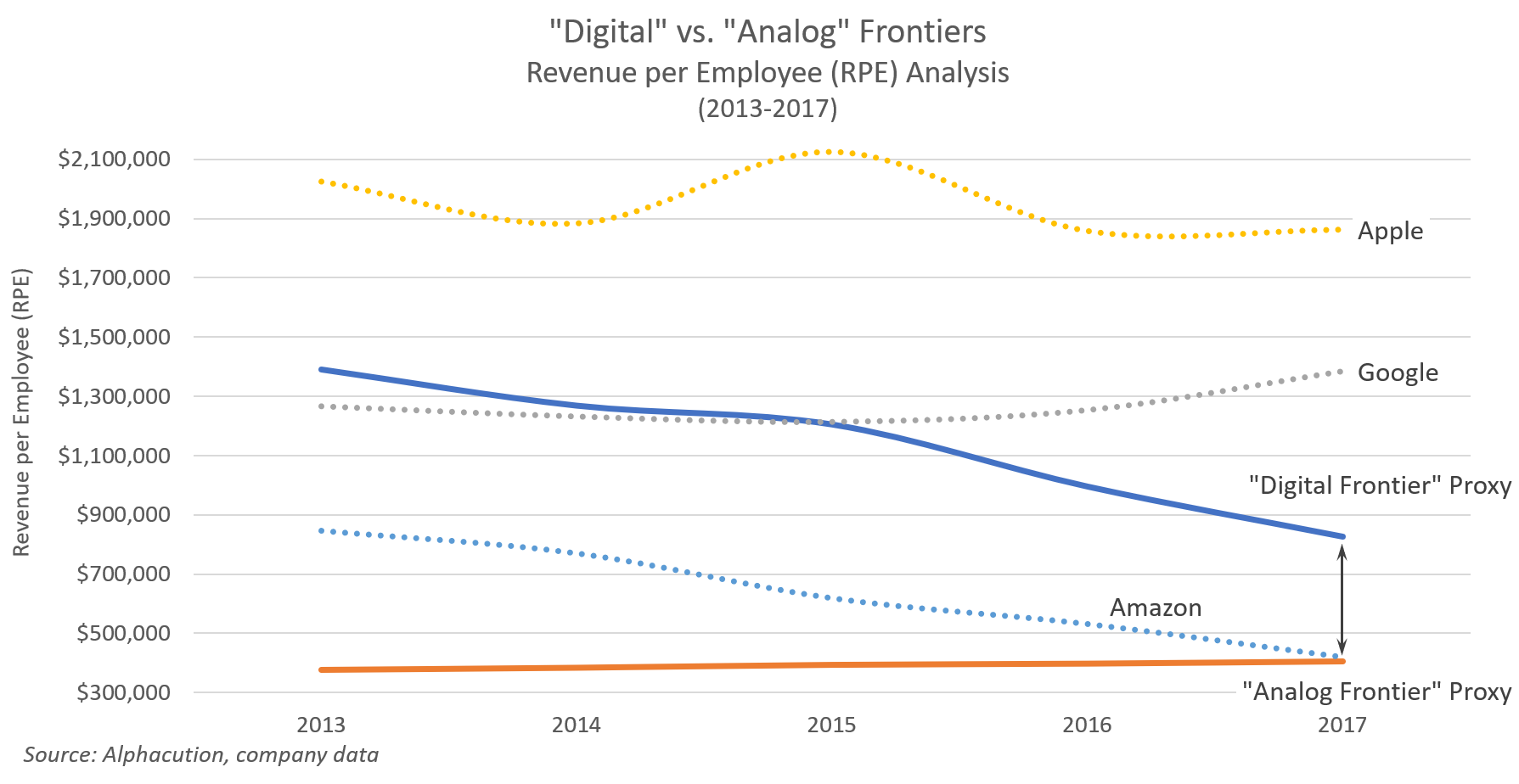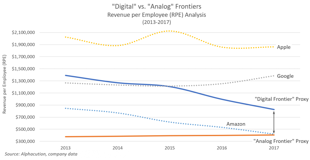 The illustration above essentially shows that the digital frontier is roughly 2 – 4x more productive per employee than the incumbents (and these are a couple of the strongest incumbents in the world). And, that digital frontier is only declining because of the scale (in headcount) of Amazon – particularly, given its recent acquisition of Whole Foods – relative to Google and Apple.