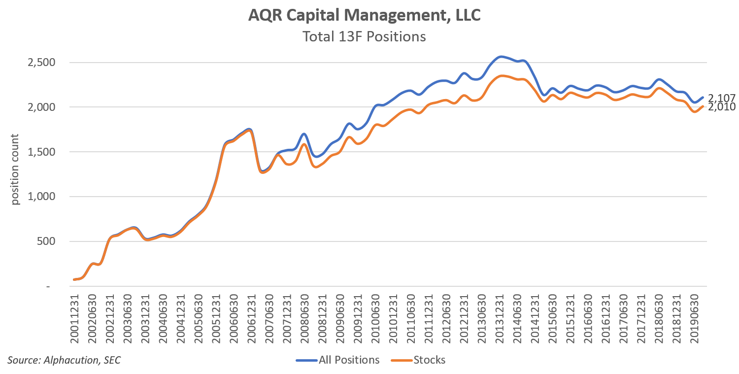 For 12 straight years beginning Q4 2001, AQR Capital Management, LLC (AQR) – one of the great and legendary hedge funds of the current era – grew equity positions until peaking at 2,346 (long equity) positions by Q4 2013. Since that time, AQR’s long US equity book has found an ominously consistent plateau of about 2,050 positions. And, in what would normally seem to be a benign factoid, lie the seeds of the story for why AQR has been suffering performance challenges of late – and apparently, for the foreseeable future (according to co-founder, Cliff Asness).