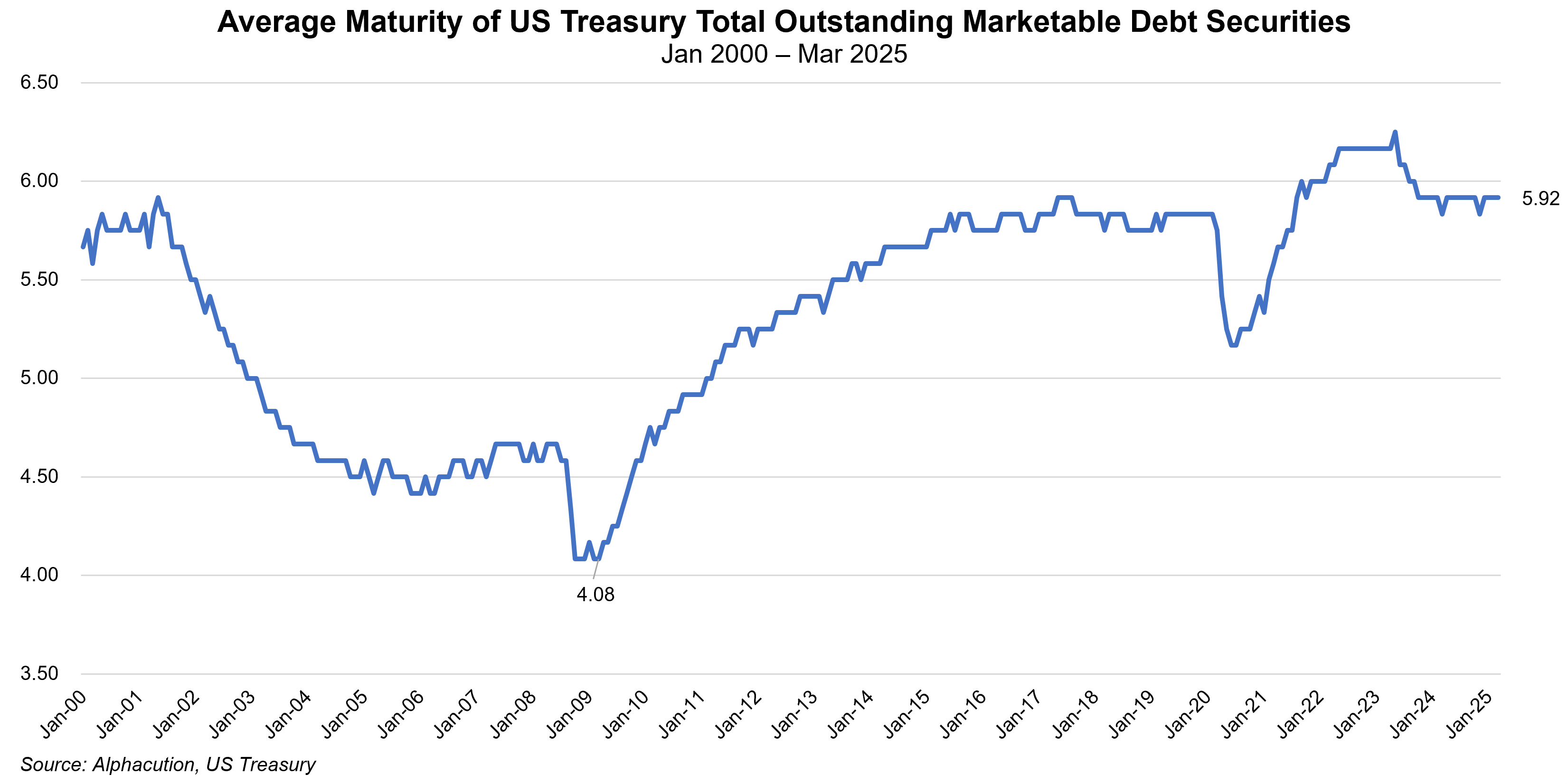- Average maturity of total outstanding marketable Treasury debt is at the high end (5.92 years*) of a 25-year range;