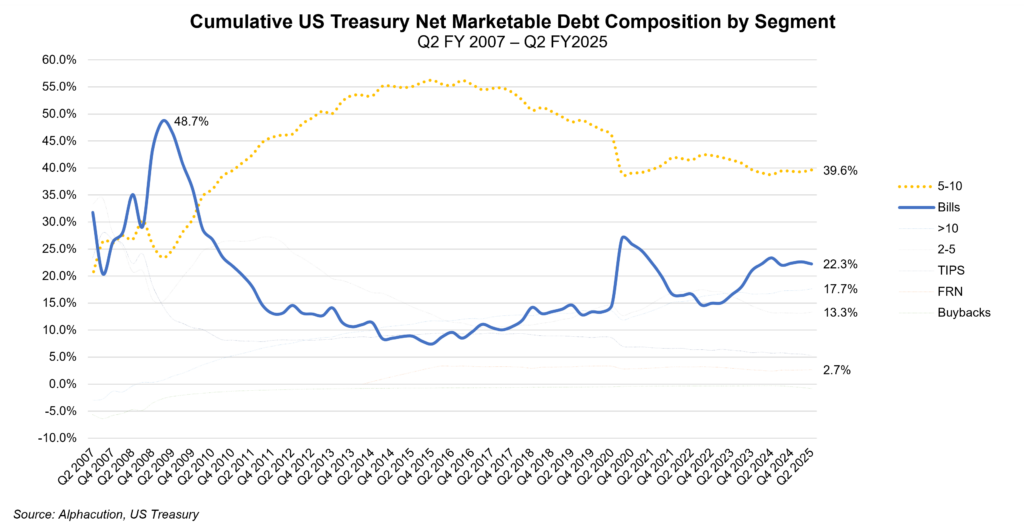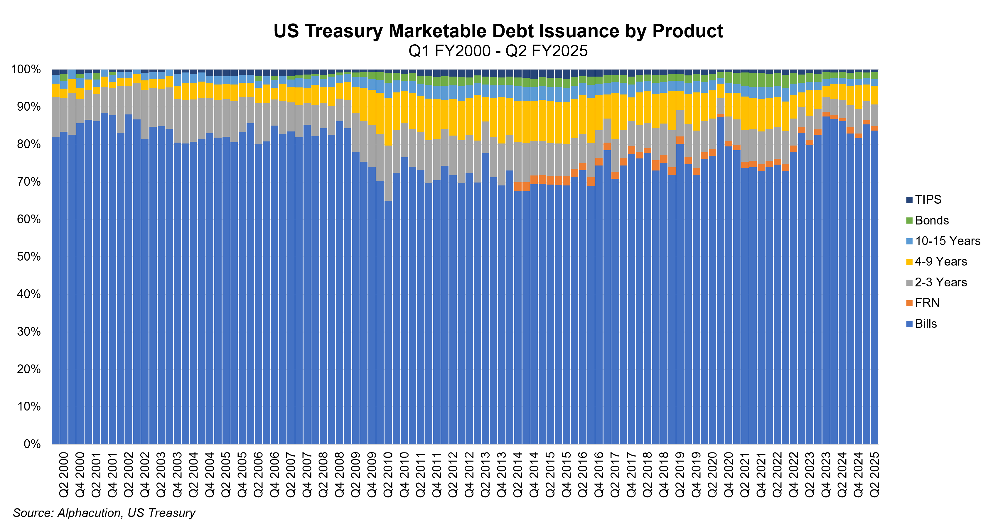 - Combined T-Bill and ~10y T-Bond issuance represent a majority of overall Treasury debt issuance since 2007;