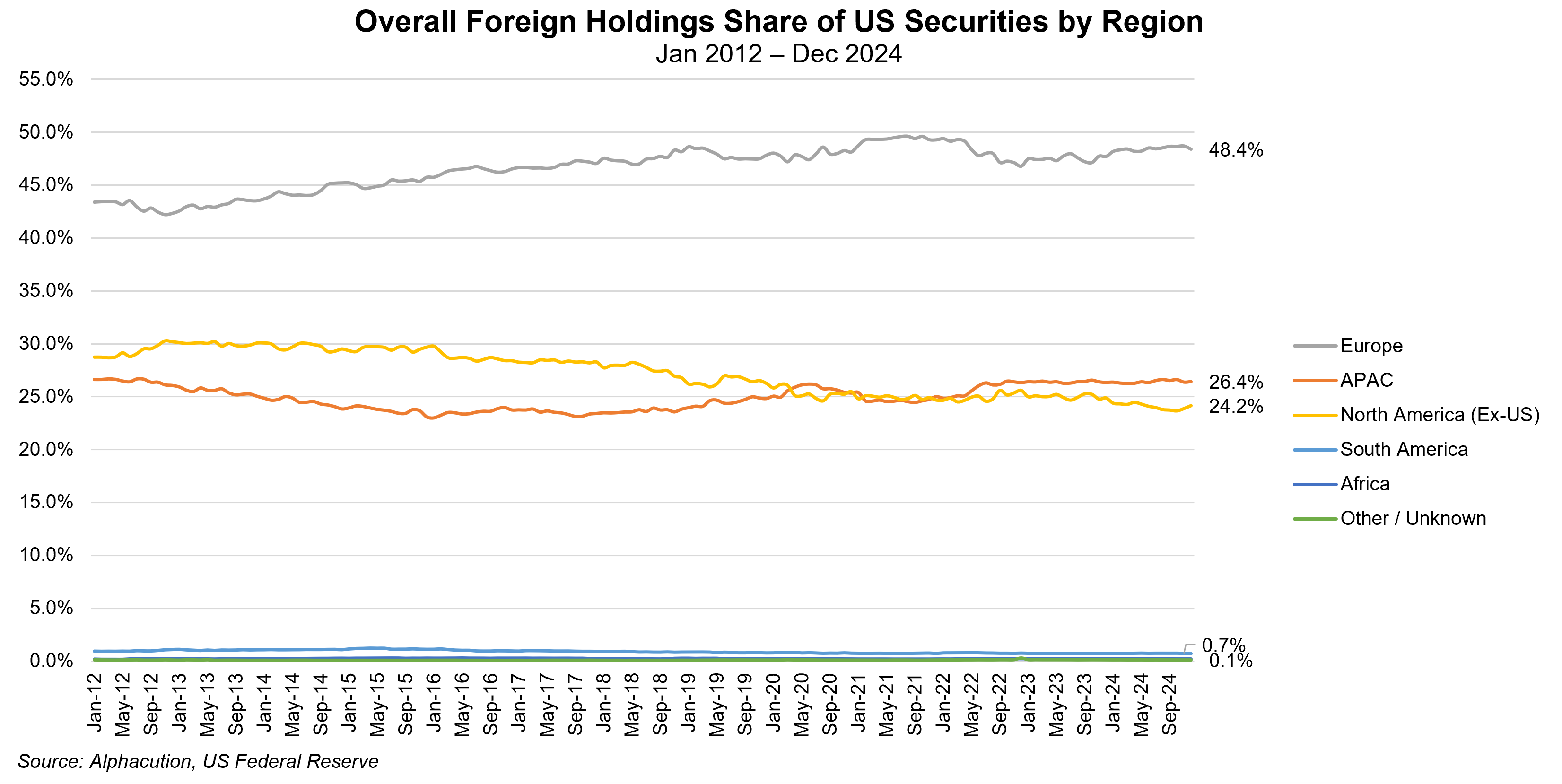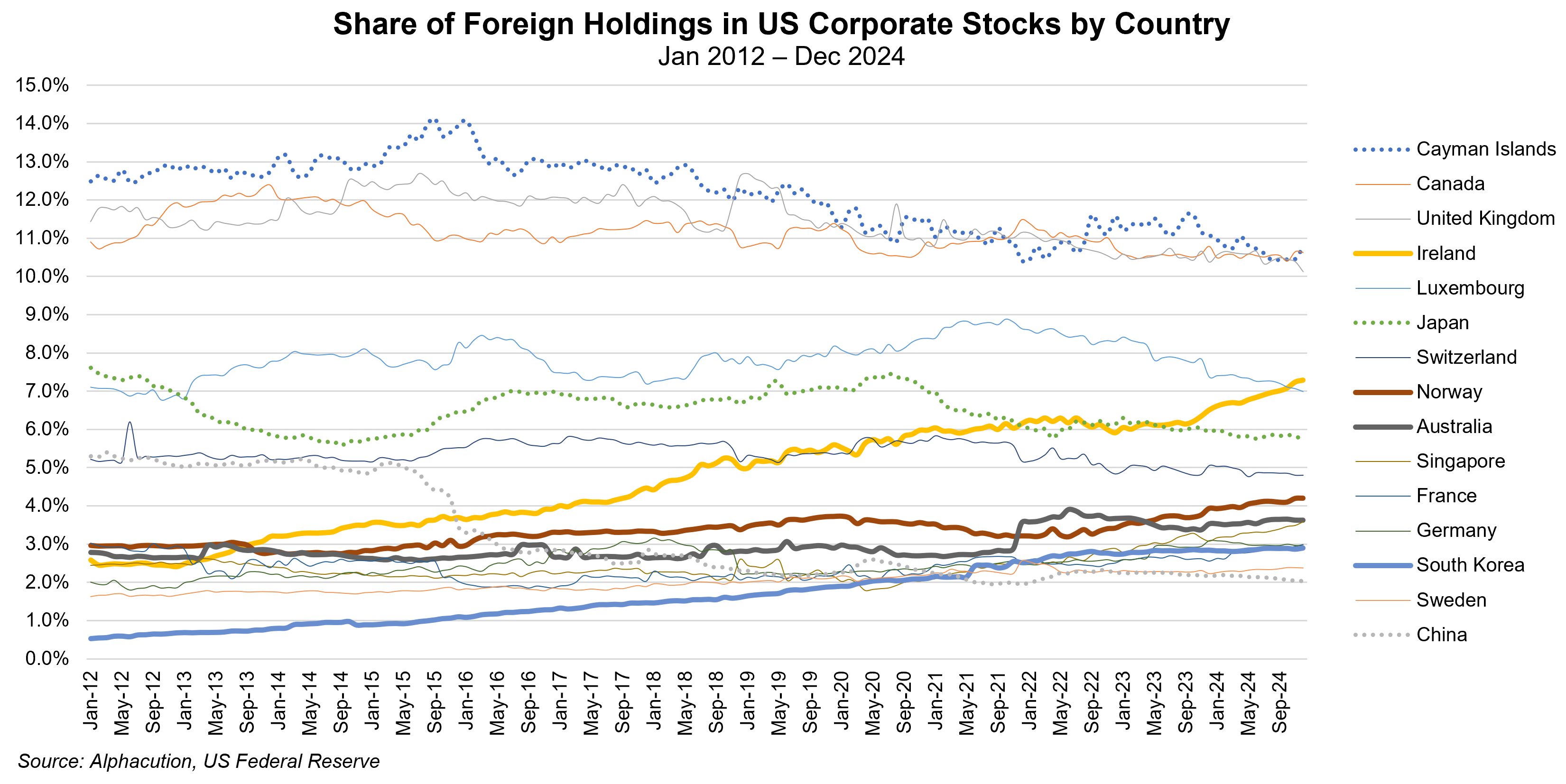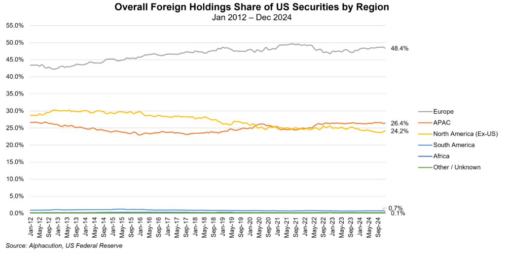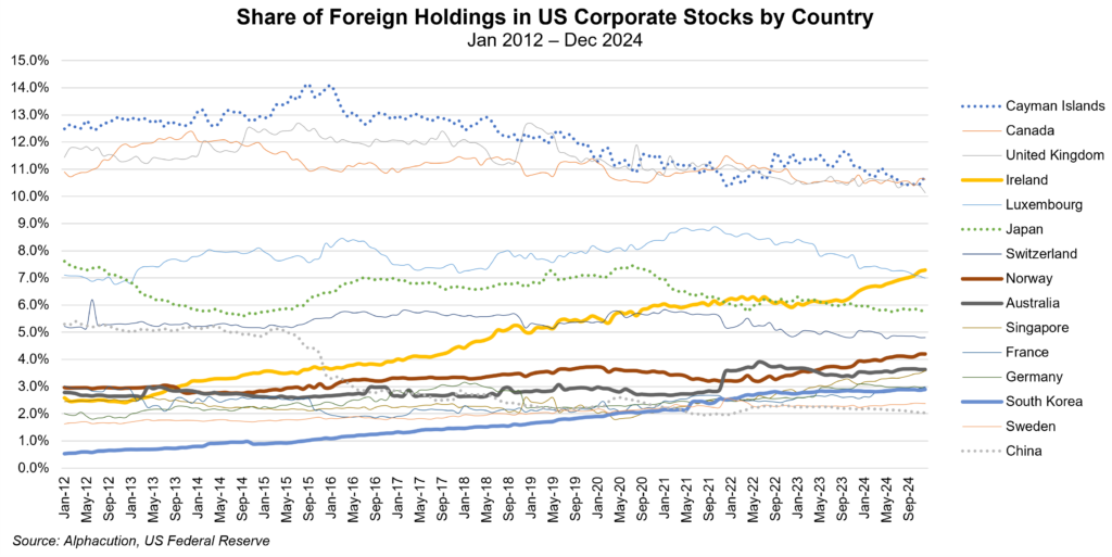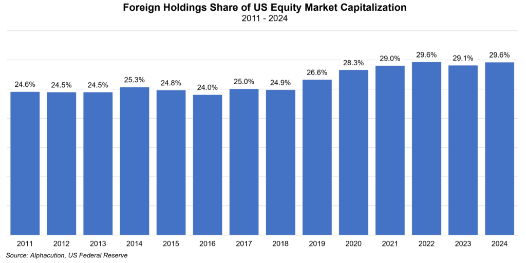 Now, for those of you who’ve been following along closely, the findings in the next chart are somewhat at odds with the findings presented in the recent Feed post, “Blood Bath: Foreign Holdings of US Equities by Domicile, YE 2024.” In that post, Alphacution’s foreign share of US equity market capitalization was based on a Goldman Sachs analysis…
