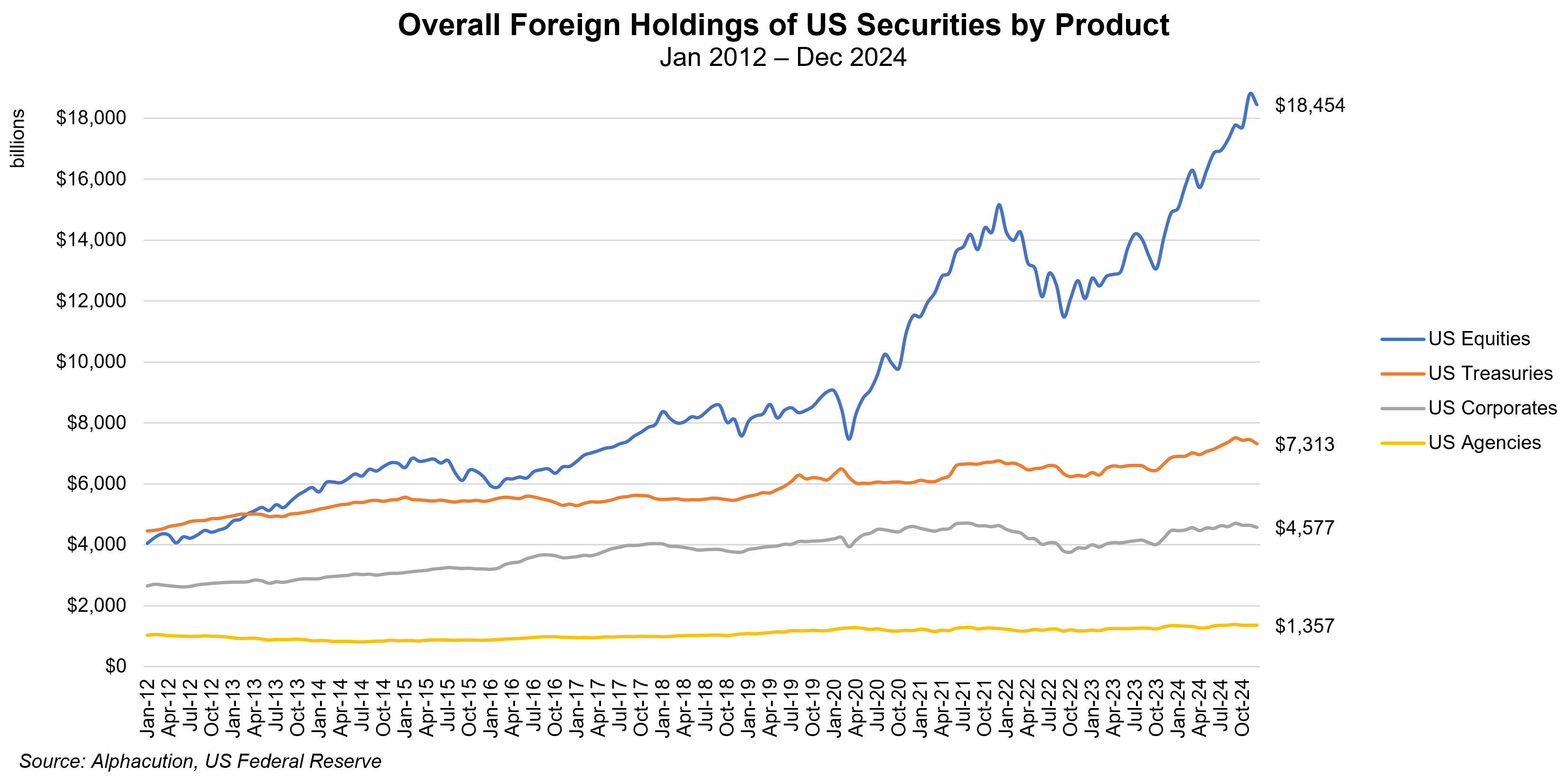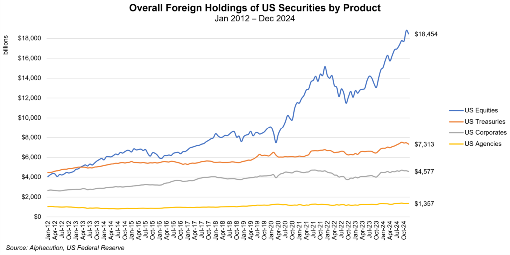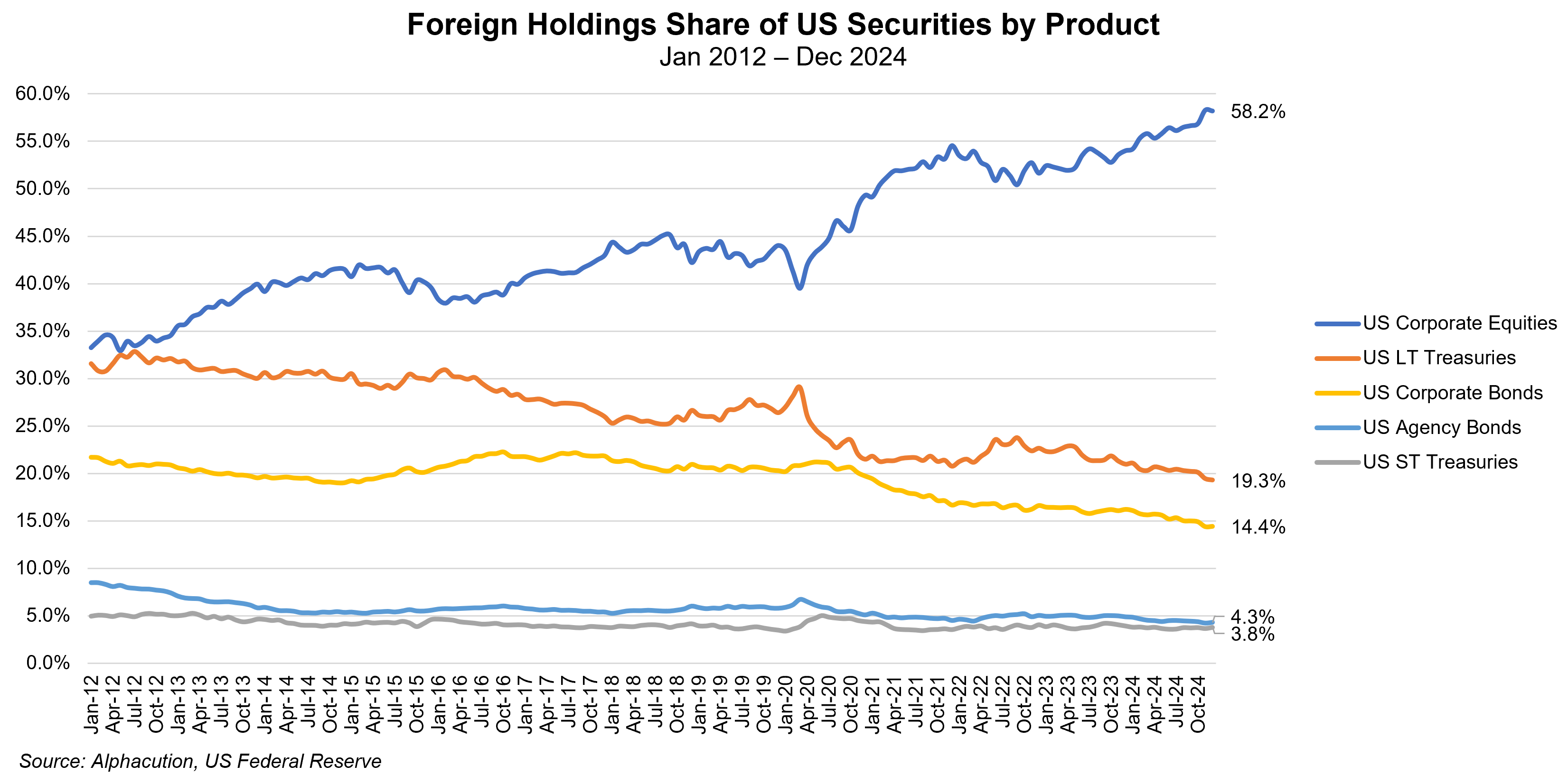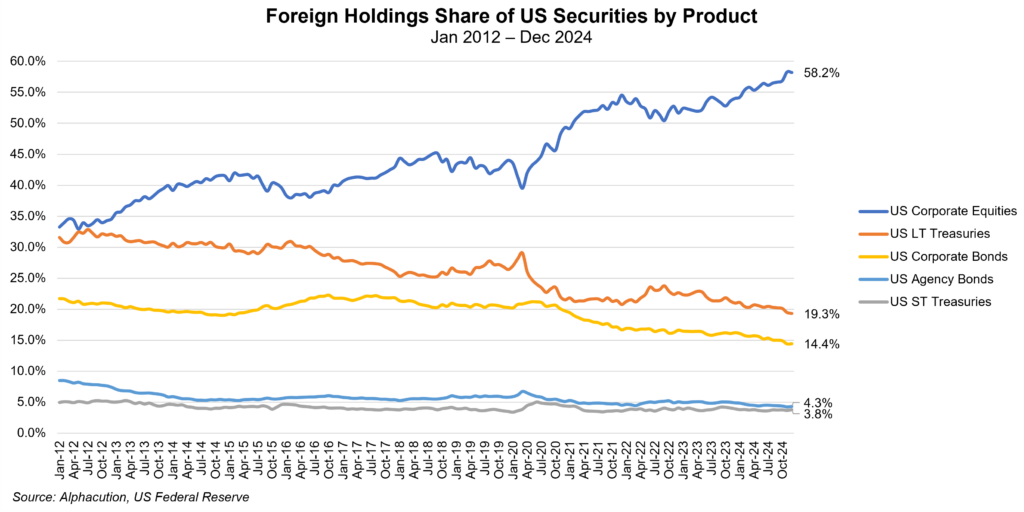 The exhibit, below, illustrates the foreign share of US securities by product – which includes holdings in stocks, long- and short-term Treasuries, corporate bonds, and agency bonds. Over the 13-year period, the share of holdings in bonds (across all product classes) has declined while the share of holdings in stocks has increased dramatically. As of year-end 2024, US stocks represented 58.2% of the total value of foreign holdings; a nearly 50% spike from ~40% concentration in US equities that began – as you might guess – at the beginning of the pandemic era in early 2020…