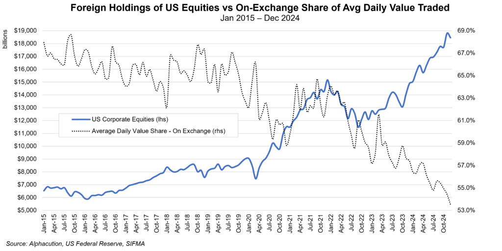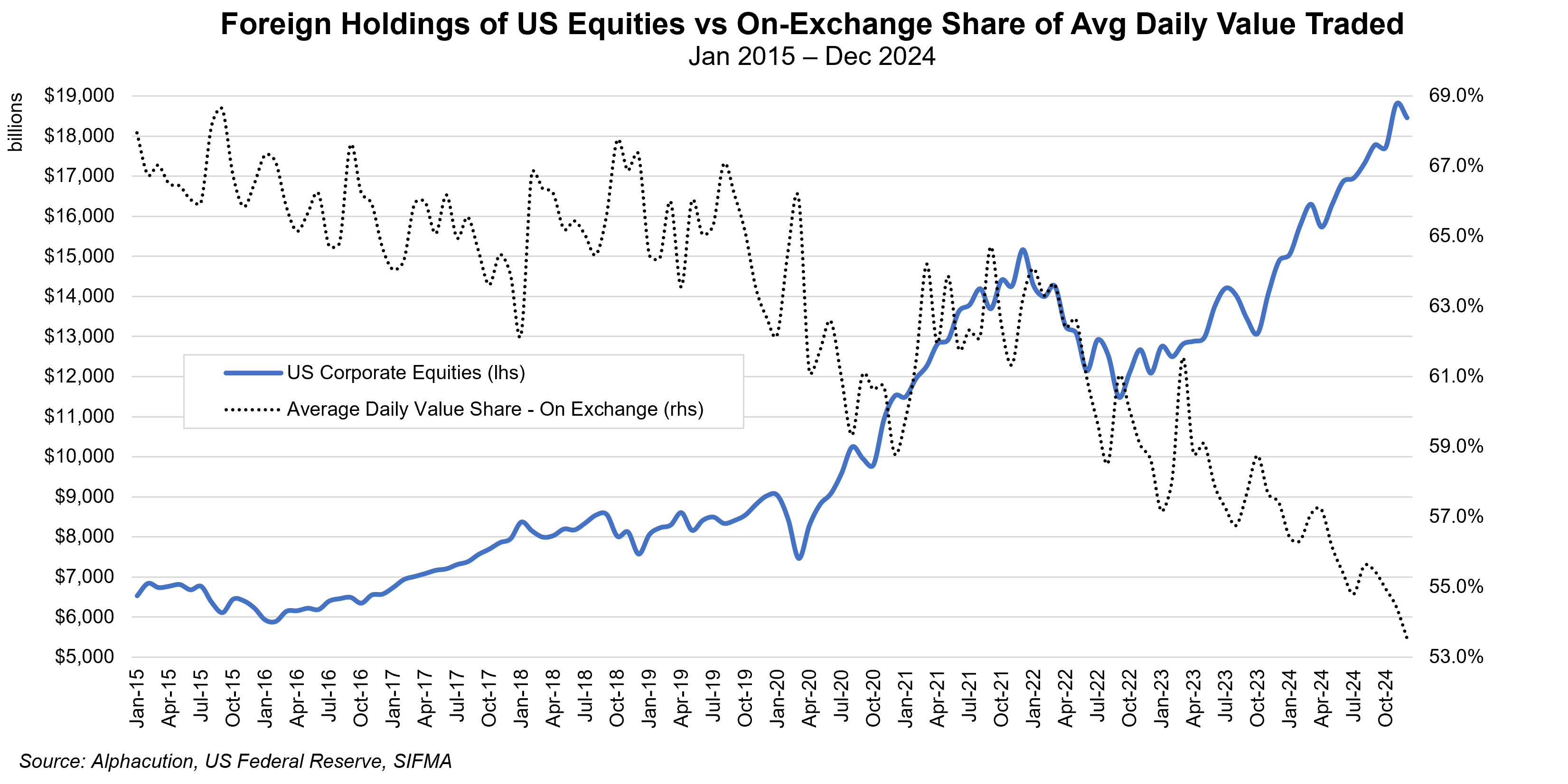 The chart below shows a comparison between the growth in foreign holdings of US equities and the decline in the on-exchange share of average daily value traded over the 10-year period beginning Jan 2015 and ending Dec 2024…