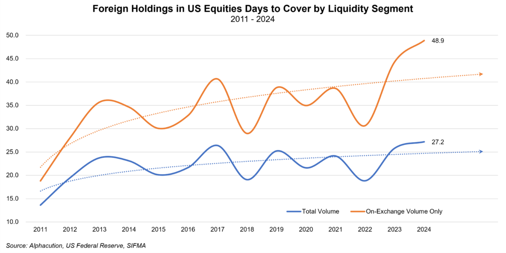 Now, the decline in the share of on-exchange value traded is relevant to both domestic and foreign institutional investors. However, given the “Trump Trade War” – and the impact it is having on global asset values, including currencies – we are merely making the argument that foreign holders of US securities may have extra near-term motivation to re-assess their exposures. The chart below – an estimate of “days to cover” for foreign holdings in US equities – is a benchmark that is at a 10-year (and maybe all-time) high…