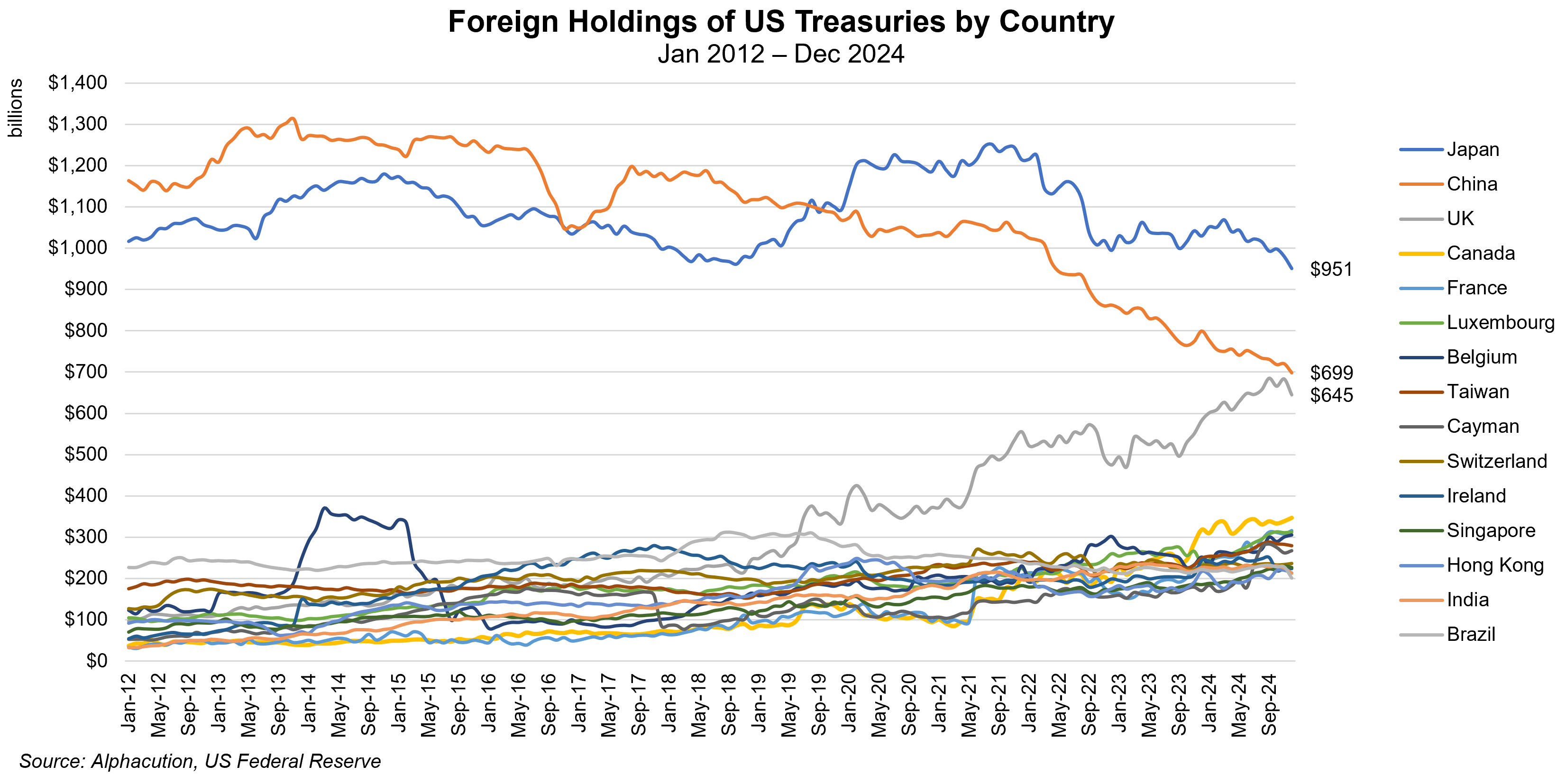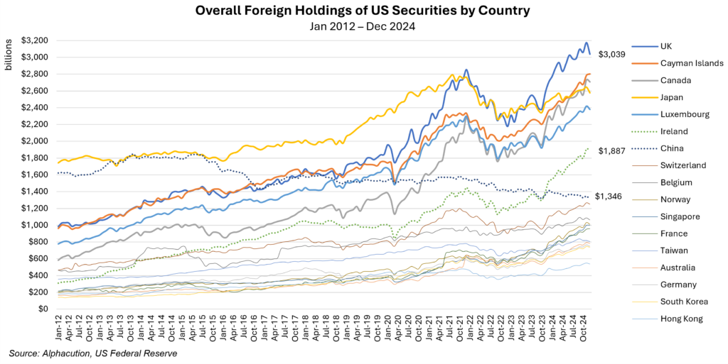 With the US national debt composition and management thereof as backdrop, let’s now turn to look at the potential impacts of tariffs on foreign holdings of US securities: