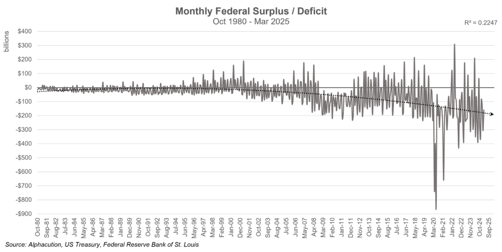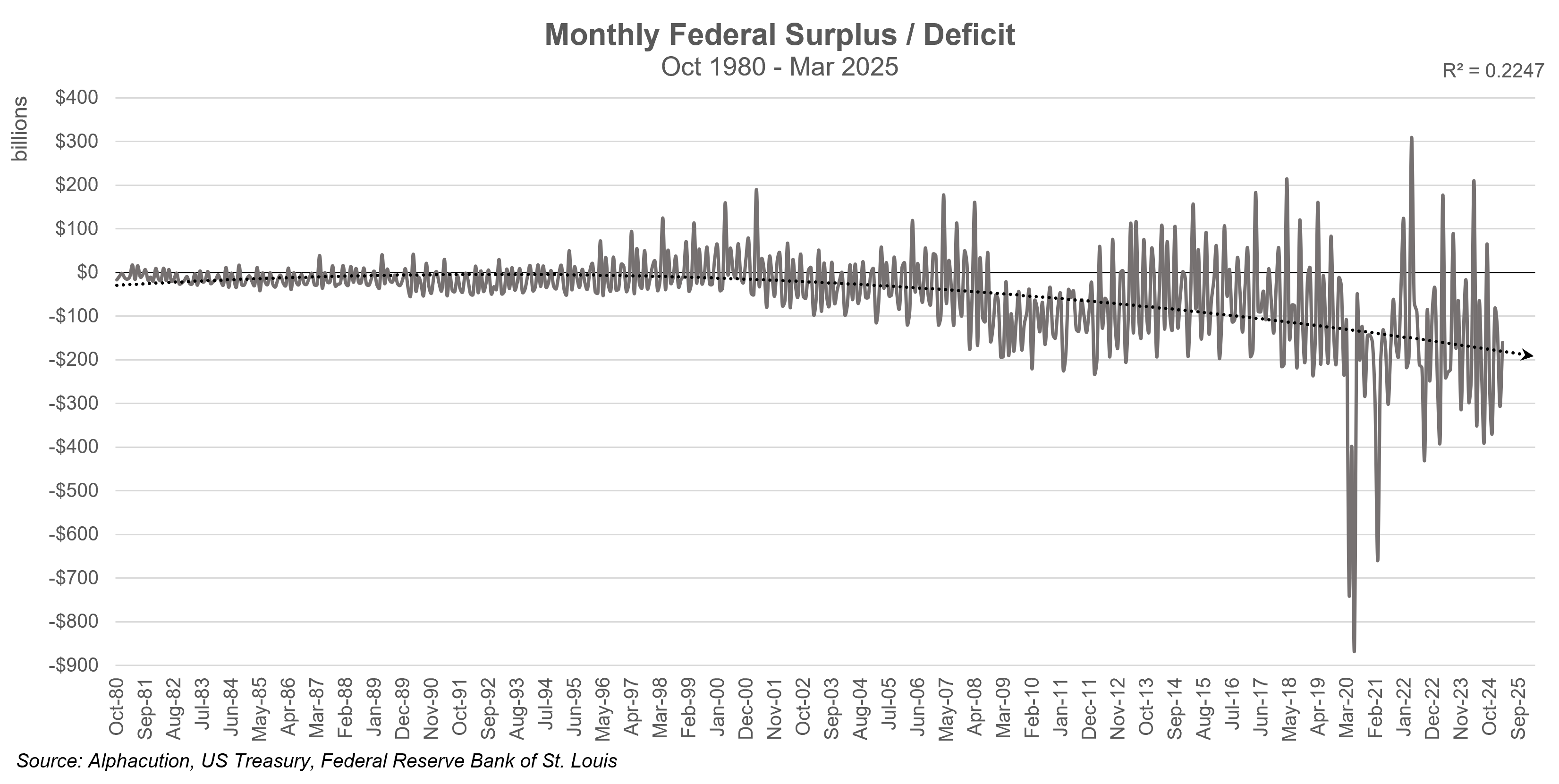 - According to FRED data through March 2025, the fiscal deficit is estimated to approach an average of $200 billion per month over the next year, all else being equal…