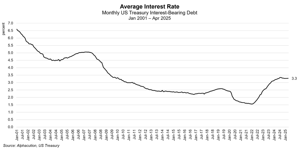 - Average monthly interest rate on interest-bearing Treasury debt (including Bills, Notes, Bonds, FRNs, and TIPS) is 3.3%*, which is below the mid-point of the 25-year range; and,