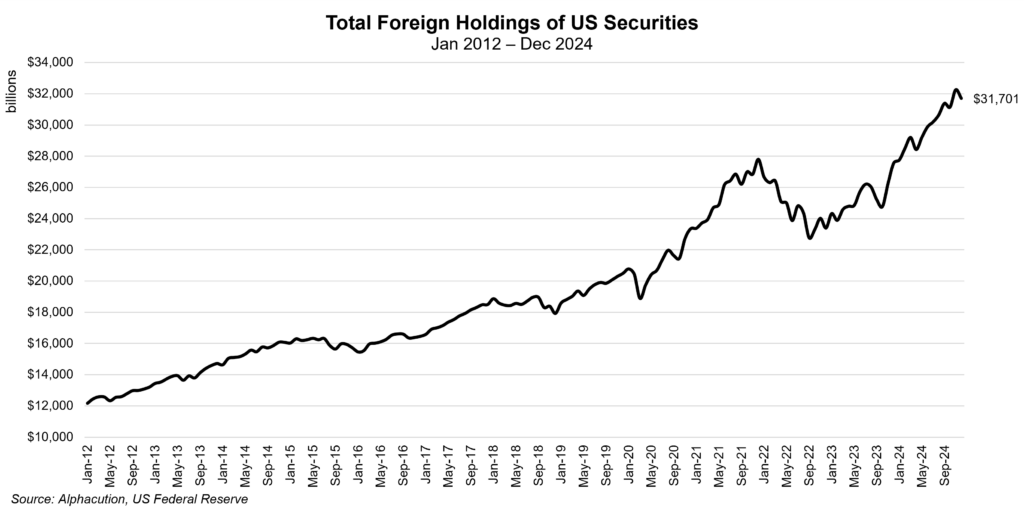 This brings us to the next chart which illustrates overall foreign holdings of US securities by product where US equities represent $18.5 trillion and US Treasuries represent $7.3 trillion as of year-end 2024. A deeper analysis would show that the short-term Treasury (T-Bill) component of this figure was $1.2 trillion and the long-term Treasury (T-Note / T-Bond) component of this figure was $6.1 trillion at year-end 2024…