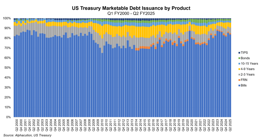 - Recent T-Bill issuance (2023 – 2024) has been no greater – as a share of total – than it was prior to 2008;