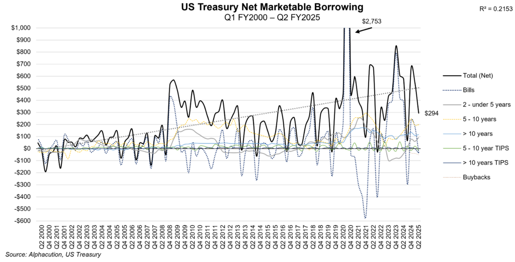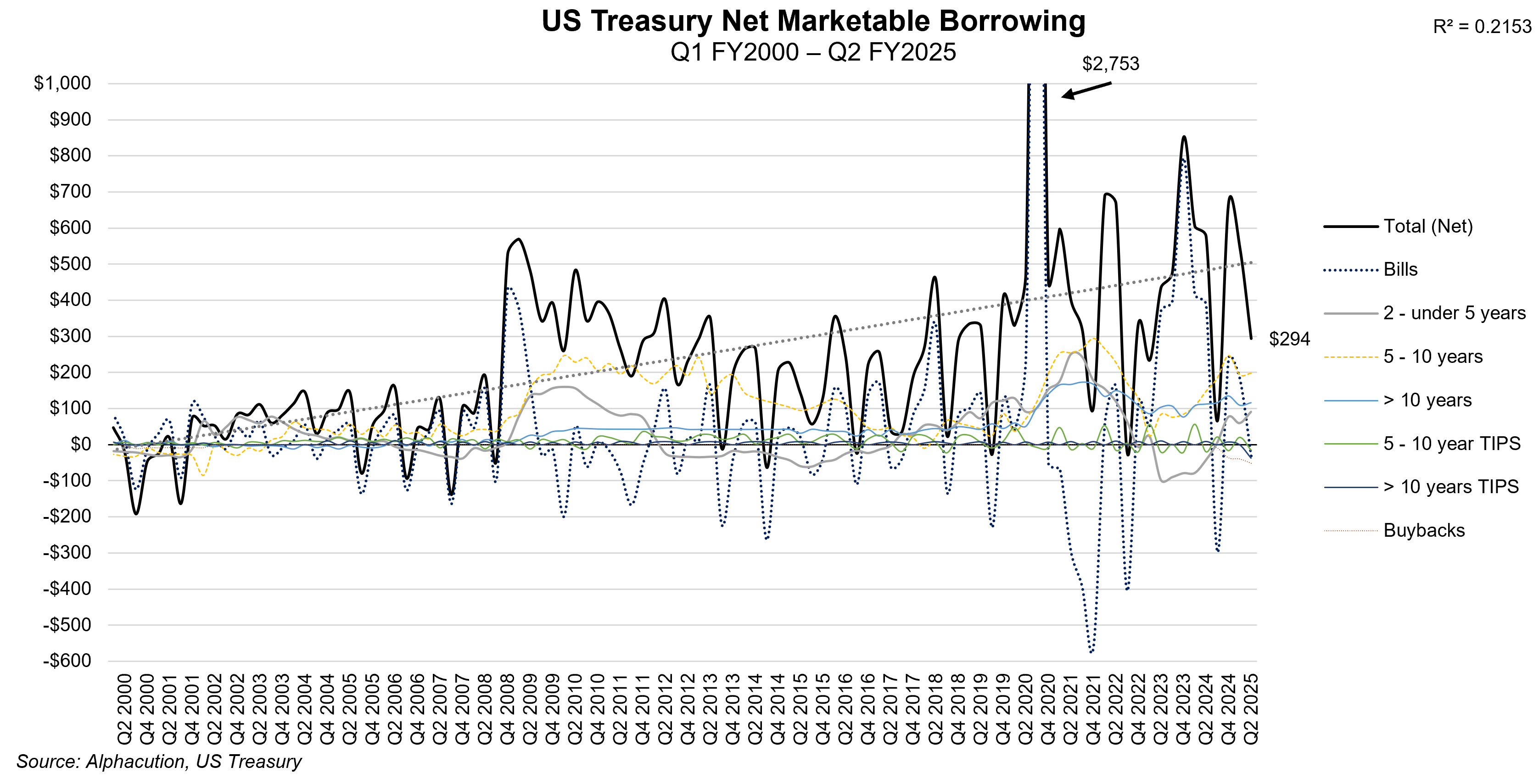 The following is an analysis of US Treasury marketable debt issuance over the past ~25 years that is intended to serve as a backdrop to Alphacution’s ongoing analysis of foreign holdings of US securities – which is itself a backdrop to our ongoing analysis of liquidity in US equities…