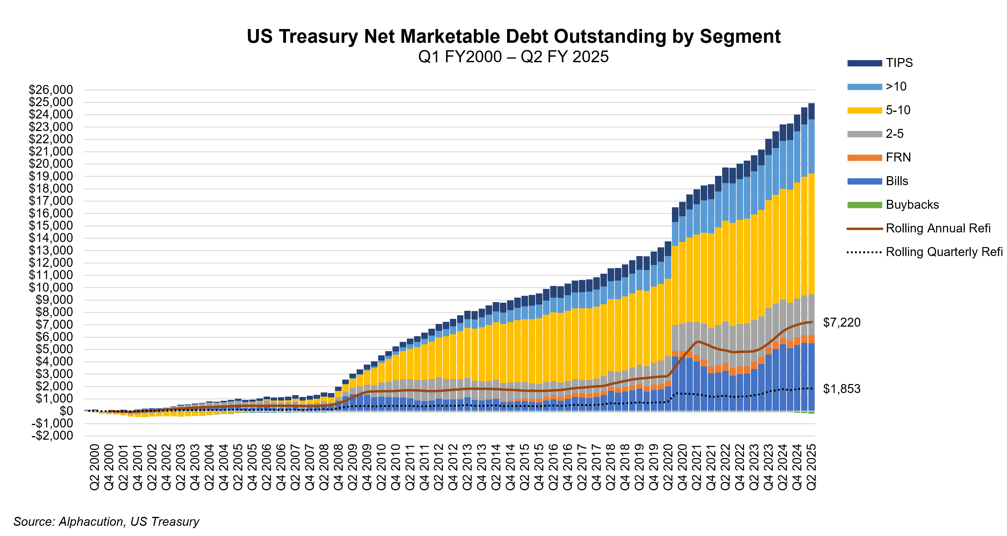 - Rolling annual refinancing levels are currently $7.2 trillion and rolling quarterly refinancing levels are currently $1.9 trillion (before any impacts from recession or other deficit-increasing events);