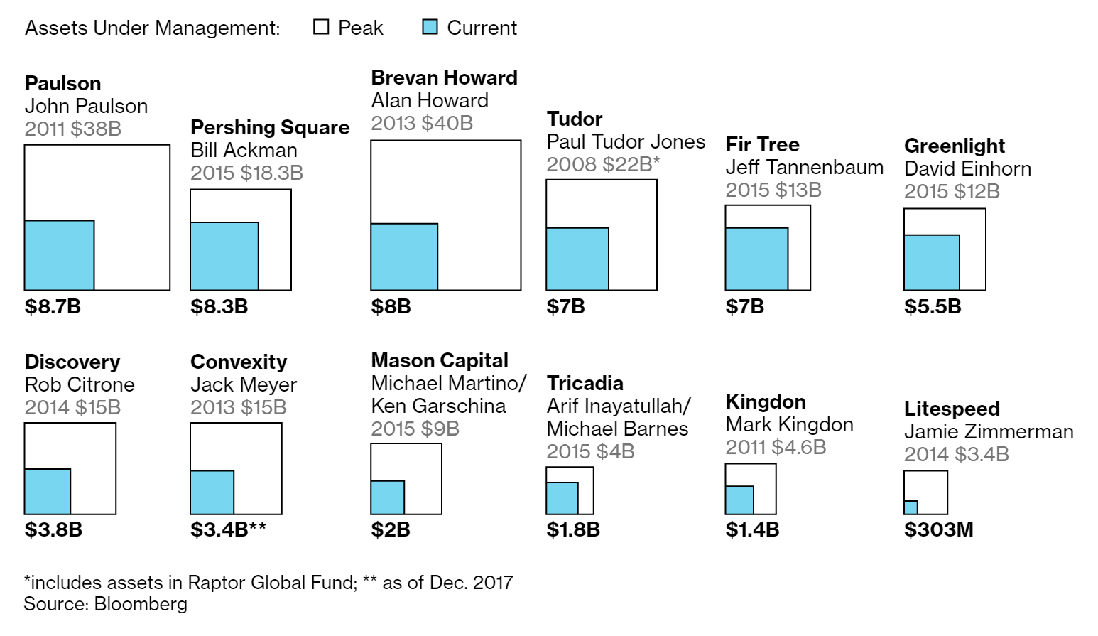 Here’s a quick reminder from Bloomberg on what has happened to some of the more notable discretionary hedge fund managers, as of December 2017:
