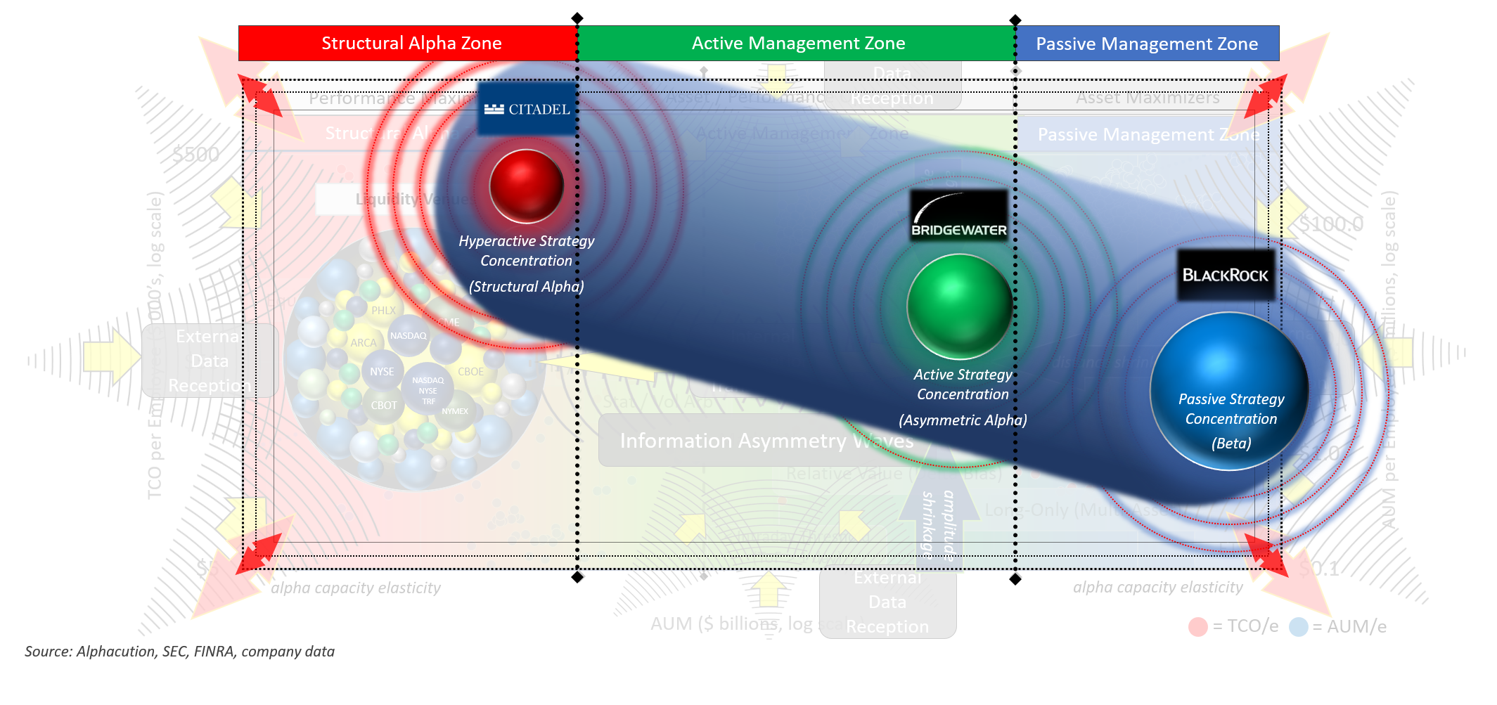 Each of these categories has a roster of leadership. According to Alphacution’s modeling and analysis to date, the leader – and possibly, dominant player – in the structural alpha zone is Citadel for its multi-product leadership in market making; in the active management zone, the leader is Bridgewater Associates for its leadership in applying quantitative methods to the largest base of assets (thus defining the outer AUM boundary of this zone); and, in the passive management zone, the leader is BlackRock for its leadership in attracting the largest, multi-trillion-dollar base of assets dedicated to exchange traded funds.
