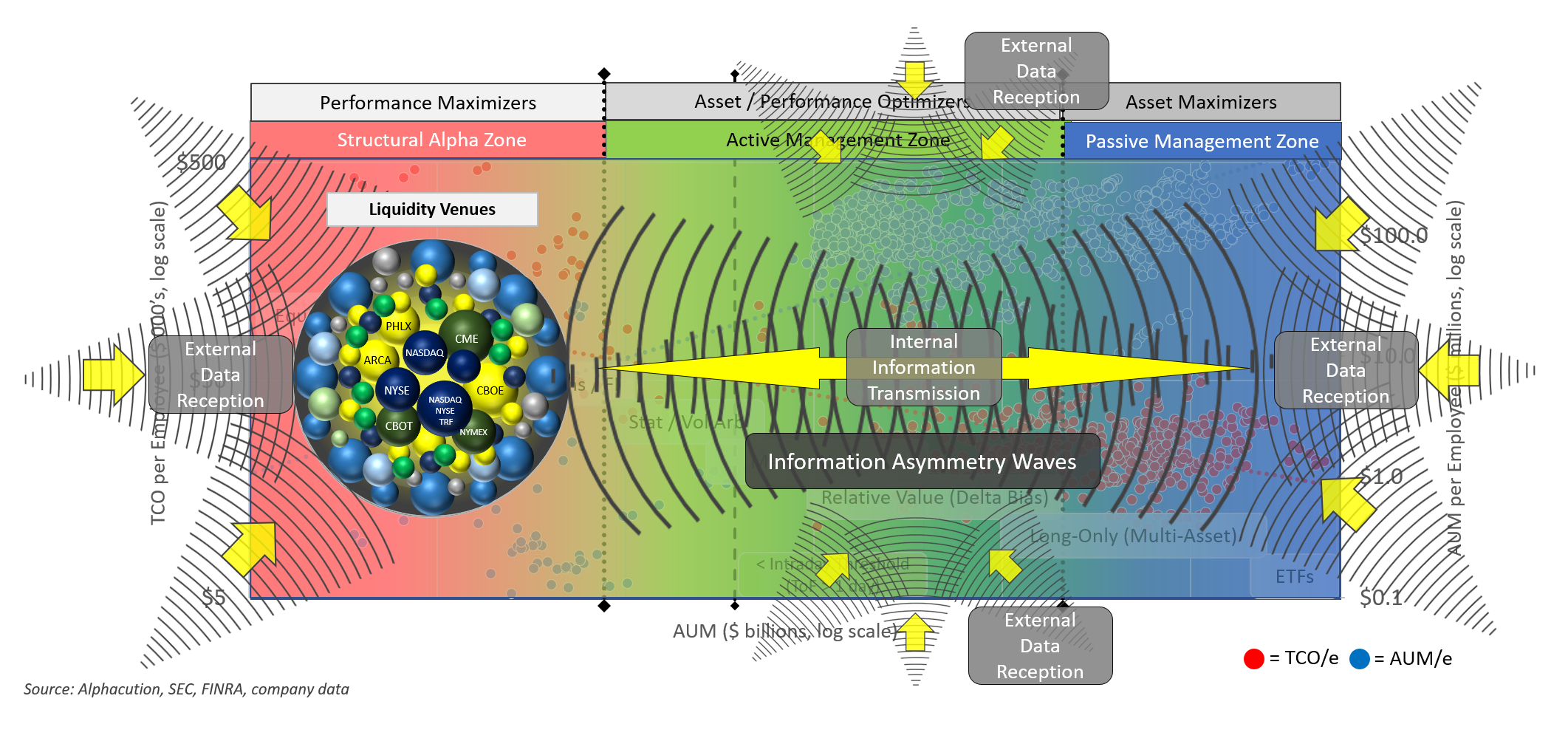 In the exhibit below, Alphacution presents new annotations on top of its original construction of the asset management ecosystem map to represent our interpretation of the market’s information consumption-dissemination mechanism, and the “information asymmetry waves” that are the result of market participants’ diversity of objectives and capabilities.