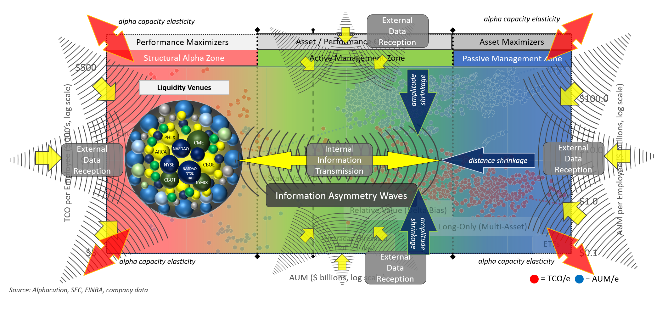 Here, what we are trying to illustrate is a compression of the information asymmetry waves; metaphorically shrinking due to the totality of structural alpha being absorbed in its native zone without leakage into the neighboring zones, plus an increasing portion of asymmetric alpha being captured by the growth in industrialized relative-value strategies. In truth, what is happening here is a contraction in the total capacity of alpha – this is alpha capacity elasticity – which shrinks the “boundaries” of the entire map. Shrinkage in information asymmetries is merely symptomatic of that contraction…