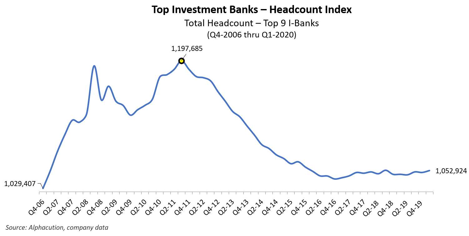 With the scent – and evidence – of economic upheaval in the air, I thought it would be a good time to revisit one of our older themes, the Investment Bank Headcount Index. The last time we touched on this topic was a year ago in, “How Many Heads Does It Take To Run A Bank?” It’s never been a wildly popular topic – hence, its infrequency of late here on the Feed – even though it’s easy to draw a direct line from it to the topics that light up our pageviews: The success of those who traffic in the private realms of trading and asset management.
