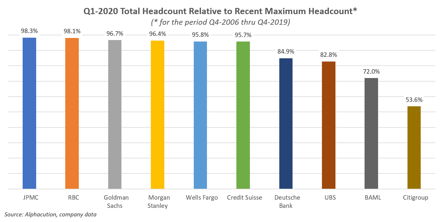 Now, admittedly, there is much going on below these headline figures. By location. By workflow function. By business unit, and so on. Furthermore, this recent “status quo” does not occur by fluke of one or two outliers. Six of ten of the banks in this index currently have total headcount within 5% of their 54-quarter maximum (since Q4 2006), see below: