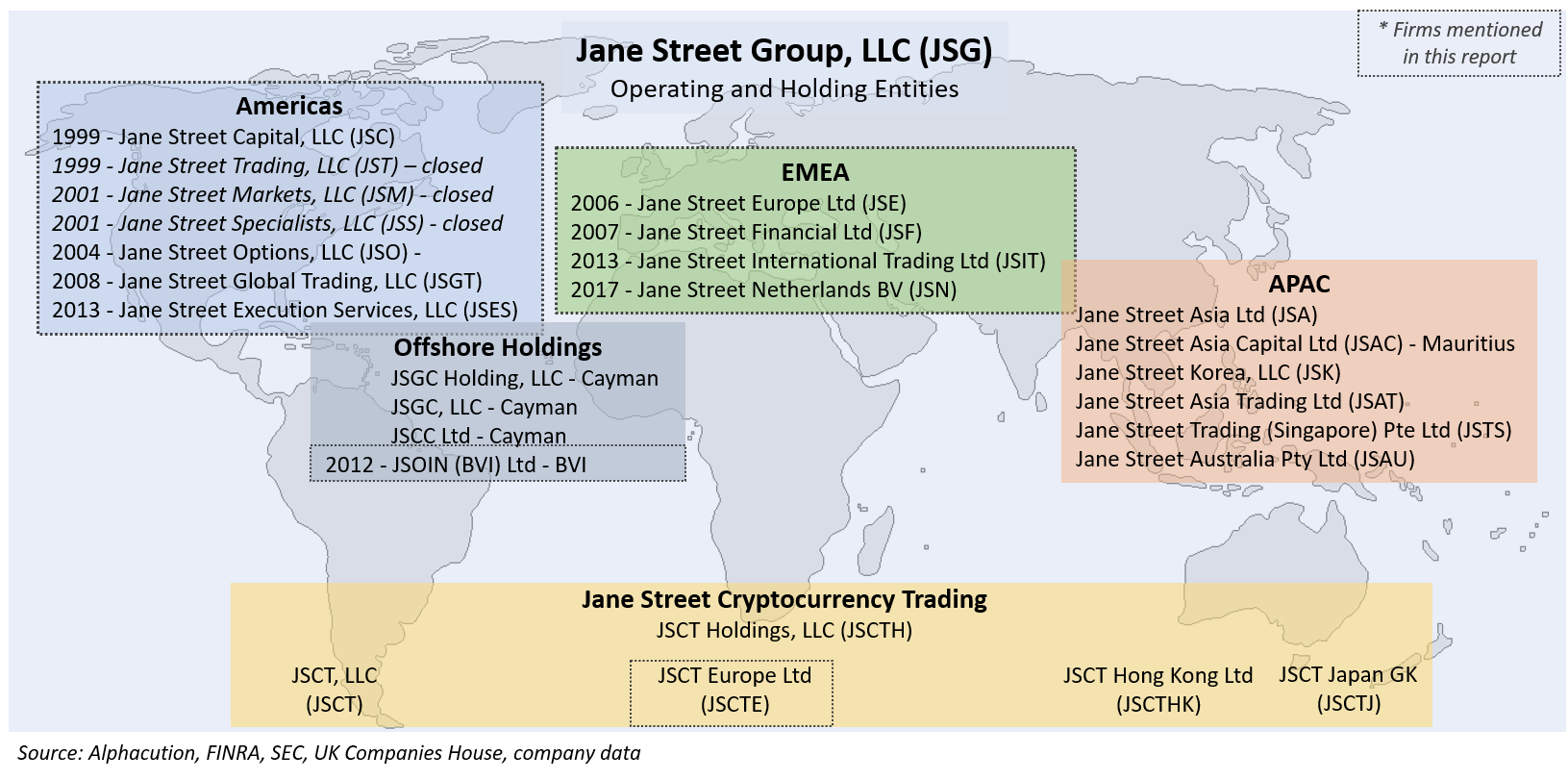 Alphacution publishes its 125-page, 149-exhibit, 26,000-word case study, “History of Jane Street,” with notable expansions into regional, US option strategy and revenue estimation details. The following is the Opening to that report with Table of Contents, including download of the full Executive Summary. Access to this report is available to Premium Subscribers. Subscription and individual report purchase inquiries can be directed to info@alphacution.com.