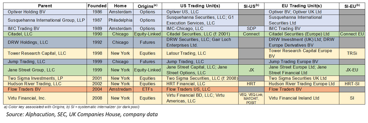 Among the global roster of proprietary trading and non-bank market making firms, Alphacution has identified twelve that epitomize the successful navigation of the contemporary gauntlet required to achieve scale. Exhibit 1, below, kicks us off with a ranked list of these firms by founding year.