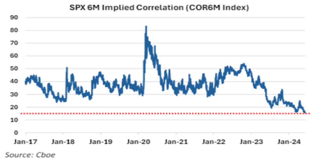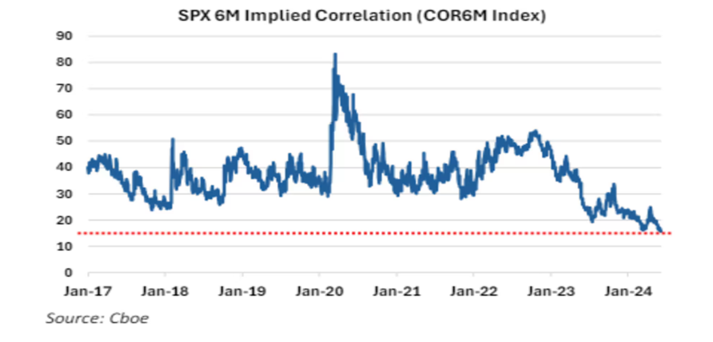 - Realized correlation moved down to historic low creating compressed realized volatility in broad market