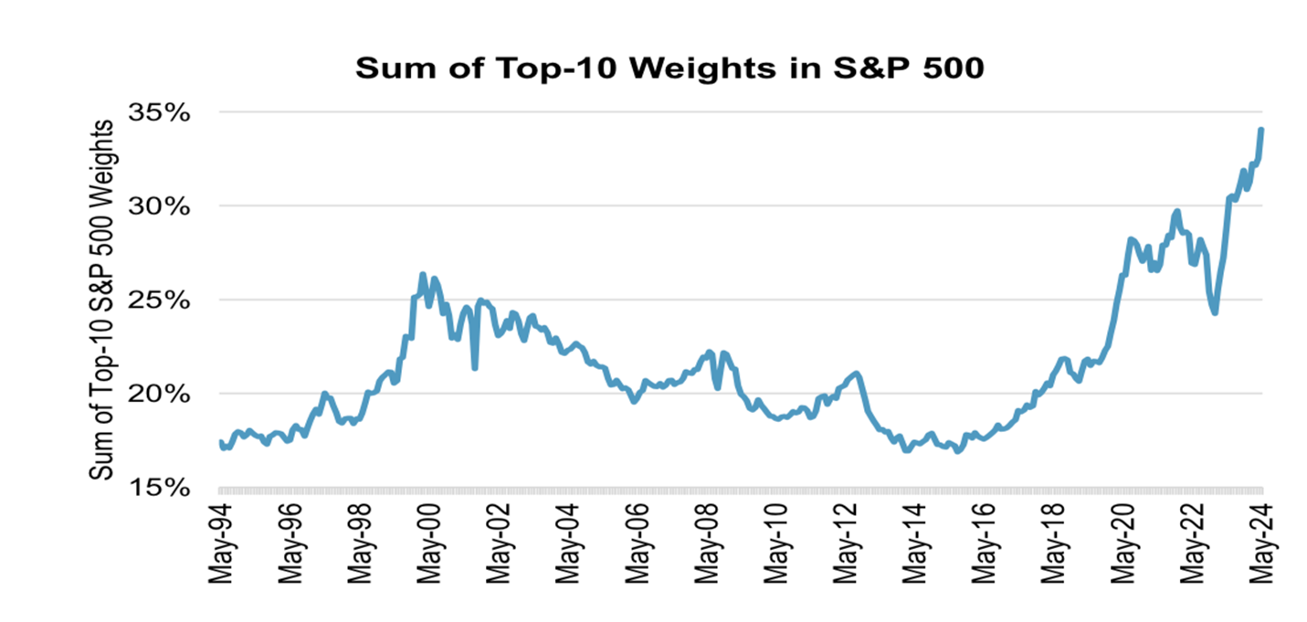 The relentless ascent of tech titans – such as Nvidia, Microsoft, and Alphabet (Google) – casts a shadow over US equity markets. Despite all-time high concentration of top 10 weighted constituents in the S&P 500, as shown below, there is a perception of calm…