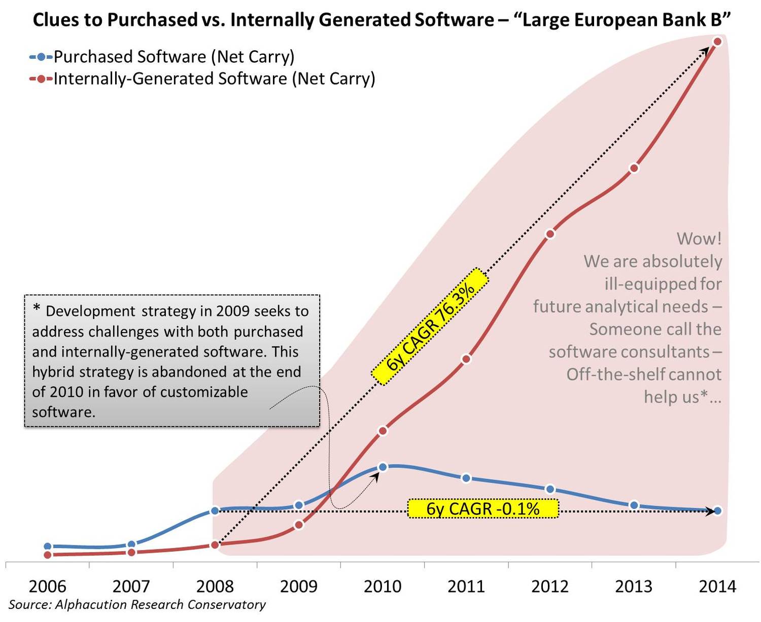 In this example, one of the largest European banks begins to ramp up investments in internally-generated software immediately after the eye of the global financial crisis (GFC) makes landfall in early 2009. And, by tracking the numbers, this bank never looks back after 2009, generating a face-melting growth in spending CAGR of 76.3% over the subsequent 6 years ending 2014. By the end of 2014, net carry value of internally-generated software is over US$ 3 billion. Meanwhile, there is an early attempt around the same time in 2009 to increase allocations to purchased software that is subsequently abandoned after 2010, generating a comparative CAGR of -0.1% over the same 6-year period ending 2014. By that time, the net carry value of purchased software stands at about 10% of the net carry value for internally-generated software.