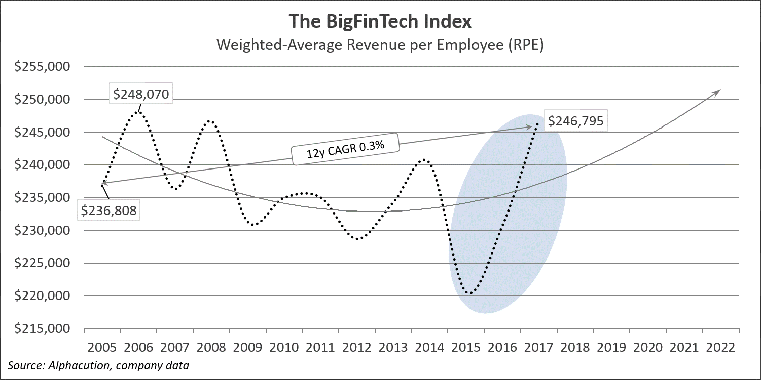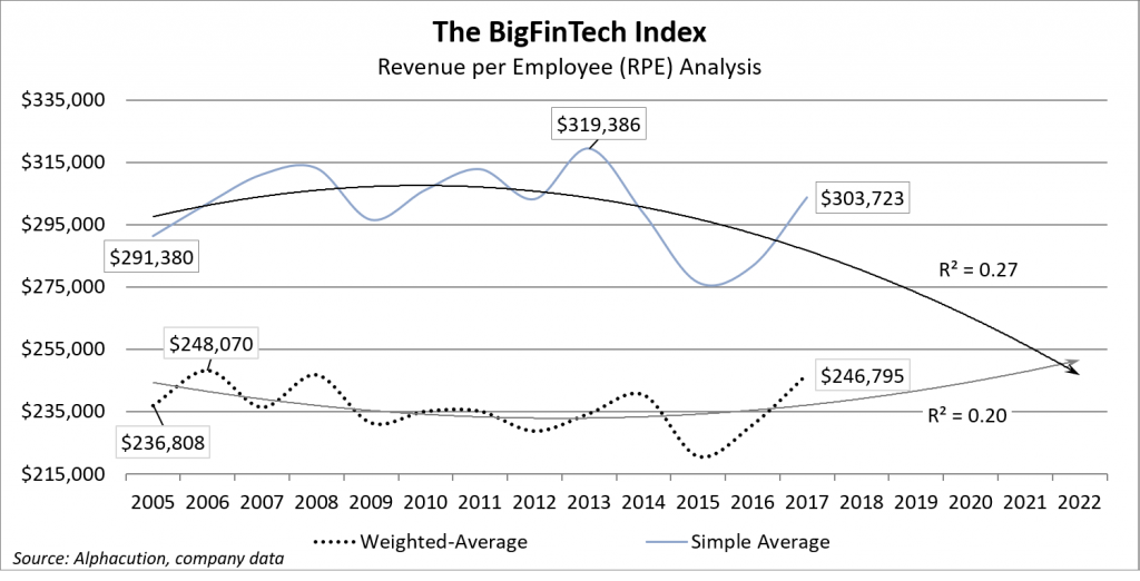 With all that still as prelude, Alphacution introduces its BigFinTech Index – the weighted-average RPE of a grouping of the largest public fintech companies; a sample that ranged from 29 to 34 companies during the study period (due to IPOs and acquisitions). Alphacution has discovered that, over the total time-series of 12 years ending 2017, the BigFinTech Index yielded limited absolute performance improvement – and has not yet returned to its high of $248,070 achieved for 2006. However, over the 2-year period ending 2017, this Index has made a notable turn with an unprecedented rise of 11.6% off its low of $220,562 and appears poised to continue improving over the coming years, as indicated by a best-fit trendline (see exhibit below).