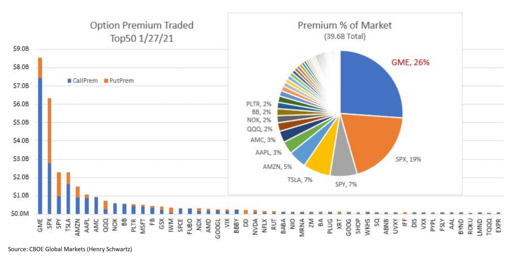Anyway, the best sense of the impact of this short squeeze is captured in the chart below, from our friend Henry Schwartz at CBOE Global Markets, where a measure of option premiums traded for GME are greater than that of all other securities, as of Jan 27.