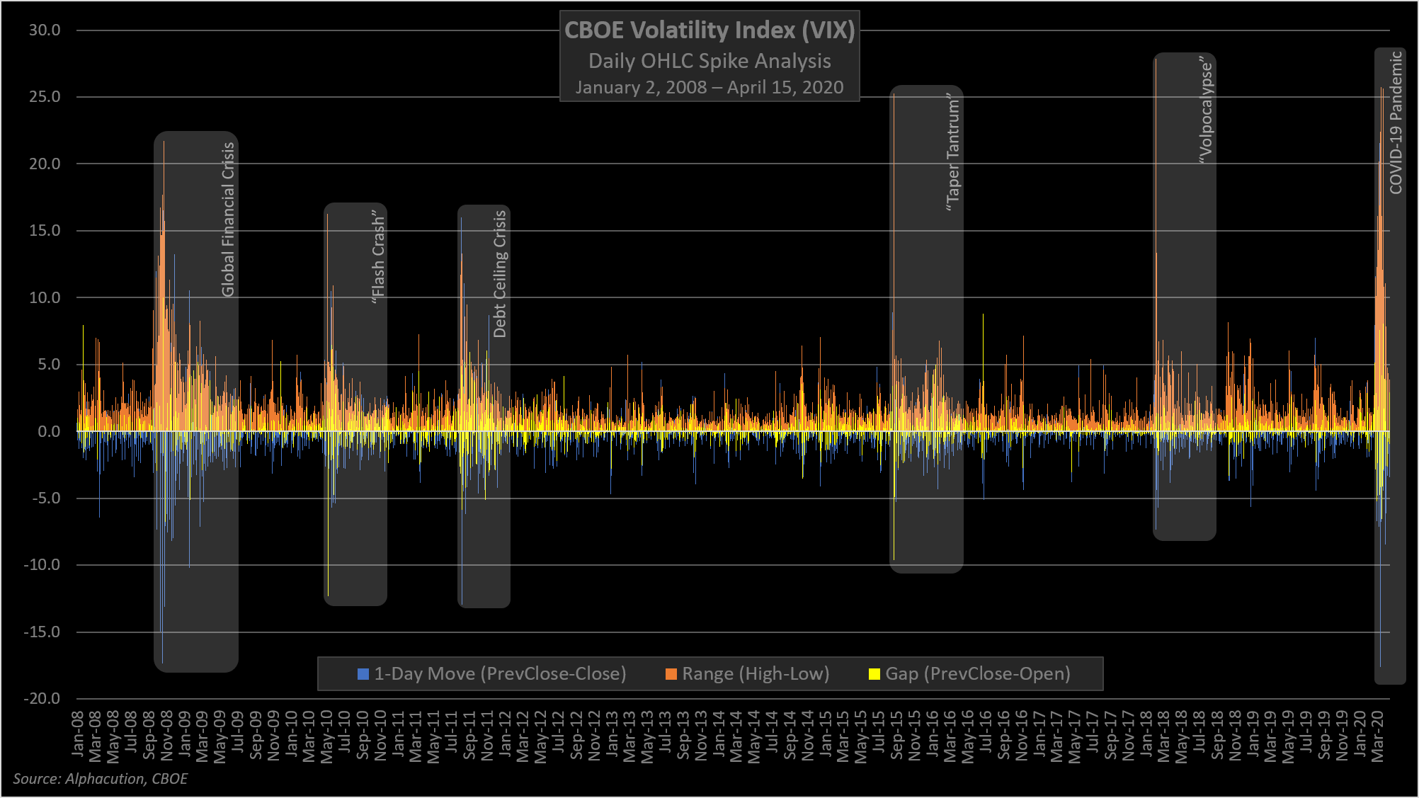 So, with this abbreviated tour of macroeconomic factors as backdrop, we arrive at the thrust of the point here: Below, is Alphacution’s rolling comparison of volatility spikes – according to VIX – for the various periods since and including the GFC, with the goal of trying to visualize how long we should expect volatility to remain elevated (defined as VIX generally greater than mid-20’s)…