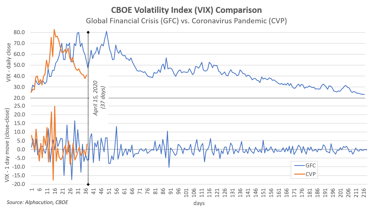 This framing brings us to our final picture for this one; a comparison of the age of the volatility elevation period between the GFC and the current CVP. What this chart shows – now just 37 days into what we think is at least a 200-day phase – is a decline in volatility that is notably faster than that of the GFC, despite the growing evidence that the CVP period will be worse – holistically – than the GFC.
