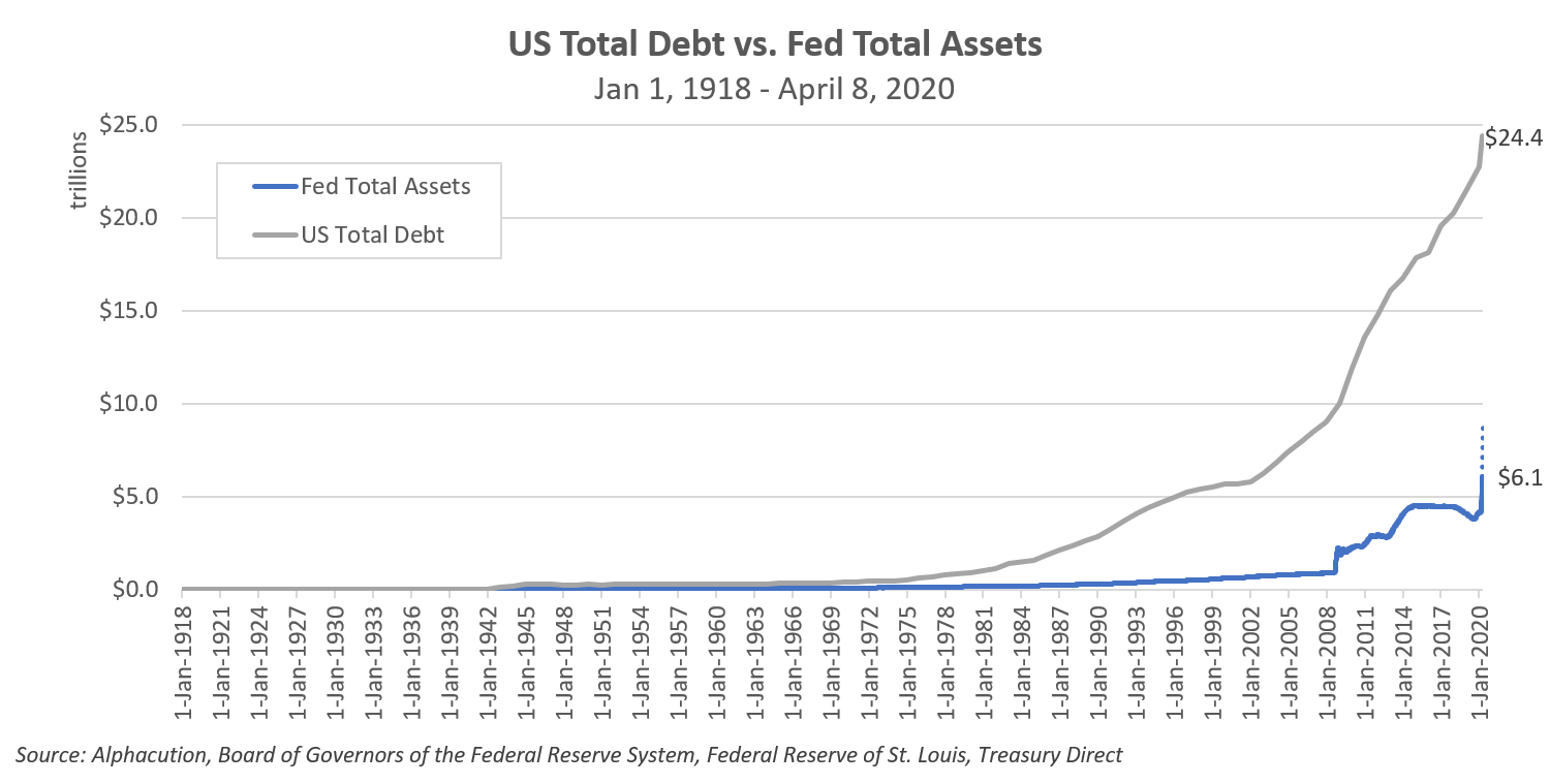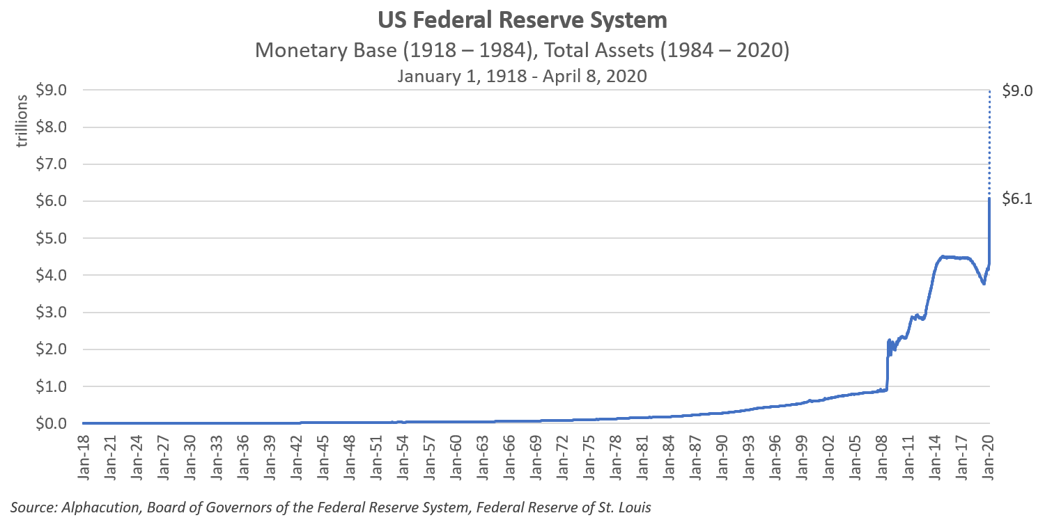 In a March 22nd note entitled “The Great Leverage Unwind” published by Guggenheim Investments, Global CIO Scott Minerd estimates the impact of the COVID-19 pandemic like this: “…we would need to see about $4.5 trillion of quantitative easing (QE) before everything was resolved. This is in addition to emergency lending through the discount window, dealer repo operations, central bank liquidity swaps, and the Commercial Paper Funding Facility, Primary Dealer Credit Facility, and Money Market Mutual Fund Liquidity Facility. That would take the Fed’s balance sheet to at least $9 trillion, or about 40 percent of last year’s gross domestic product (GDP).”