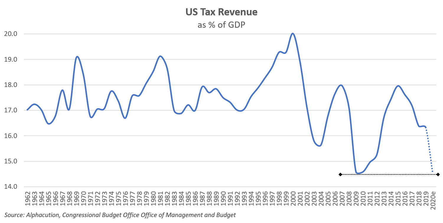 Meanwhile, with all collective headspace focused on the pandemic, we have temporarily hit the pause button on what tax revenues – and budget deficits – will look like for 2020 (and beyond) to perform insult on injury in the trajectory of the Fed hockey stick. To wit: Below, is US tax revenue as a percent of GDP from 1962 through 2019 – plus a swag of what 2020 might look like, based on what happened during the GFC: