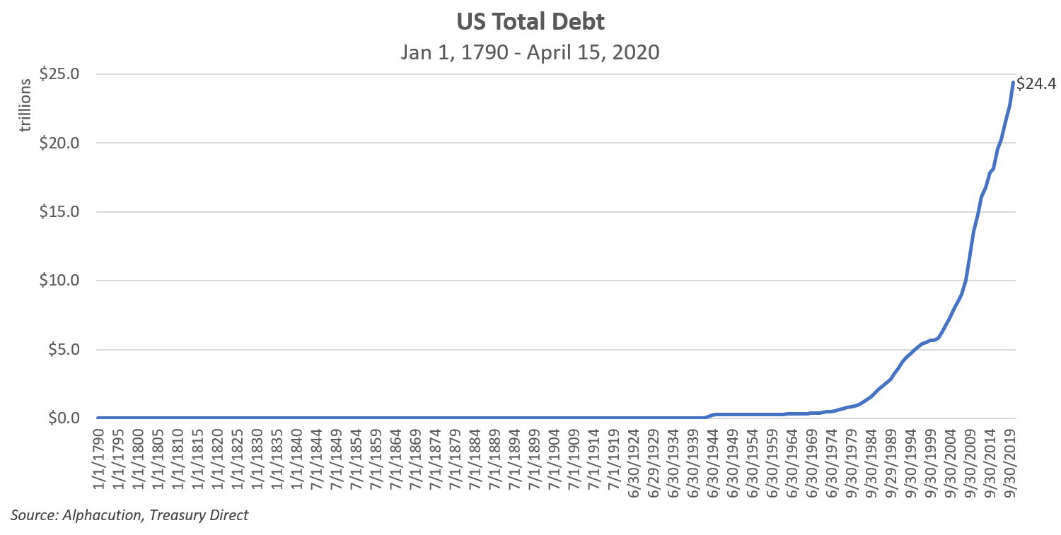 Let’s build on a rationale for a better estimate: Sticking with a wide lens and a long time series, the chart below illustrates 230 years – up through yesterday (April 15th) – of US total debt. For some reason, this hockey stick makes me think of Tricky Dick and gold, but I can’t quite put my finger on it…
