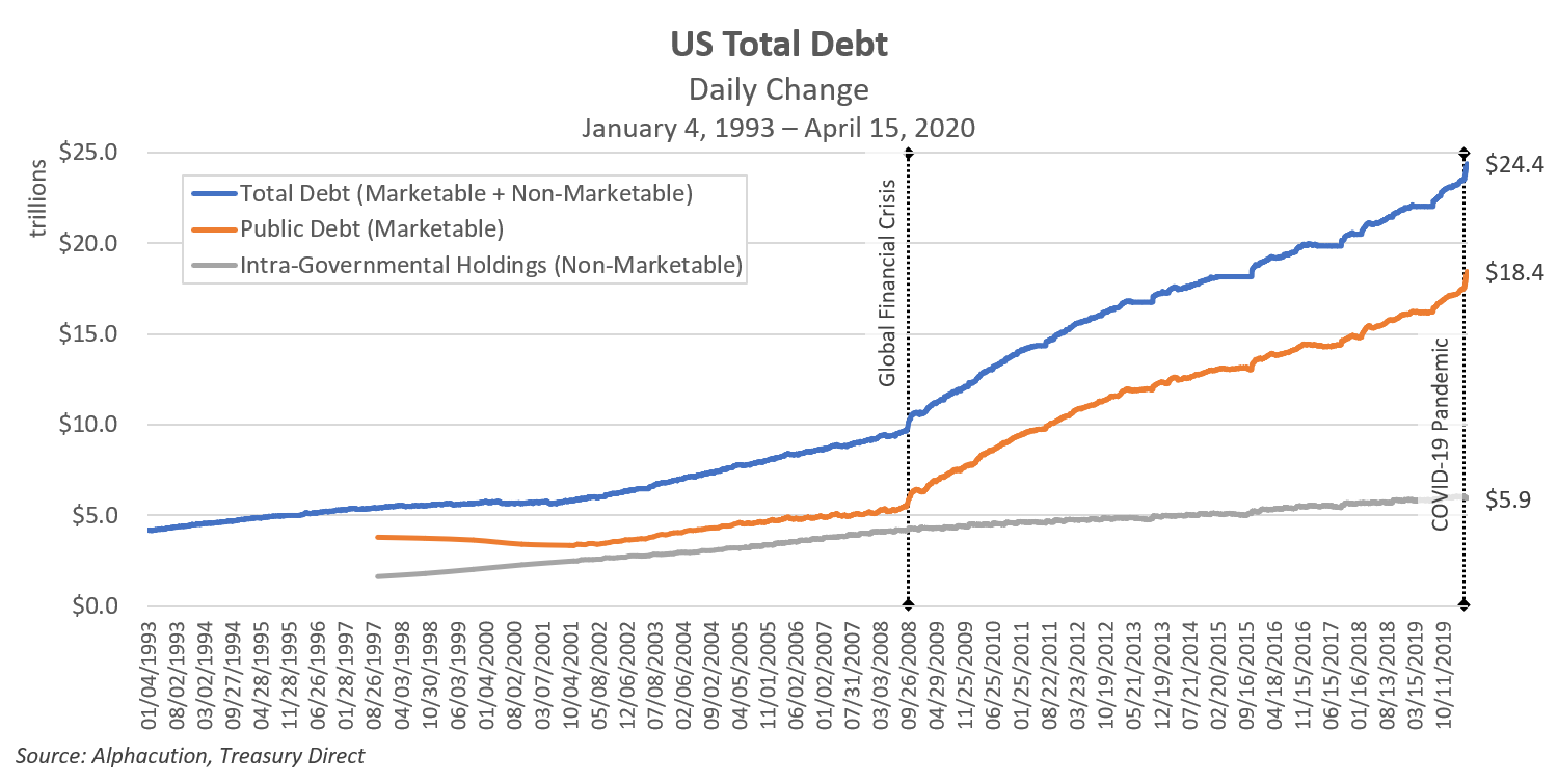 In case you’re keeping detailed score at home, the public portion of that debt – made up of marketable Treasury Bonds, Notes, Bills, etc. – amounts to $18.4 trillion as of April 15, 2020. Note the change in slope after the GFC. By the looks of it, we should expect another change in slope as a result of CVP. See below:
