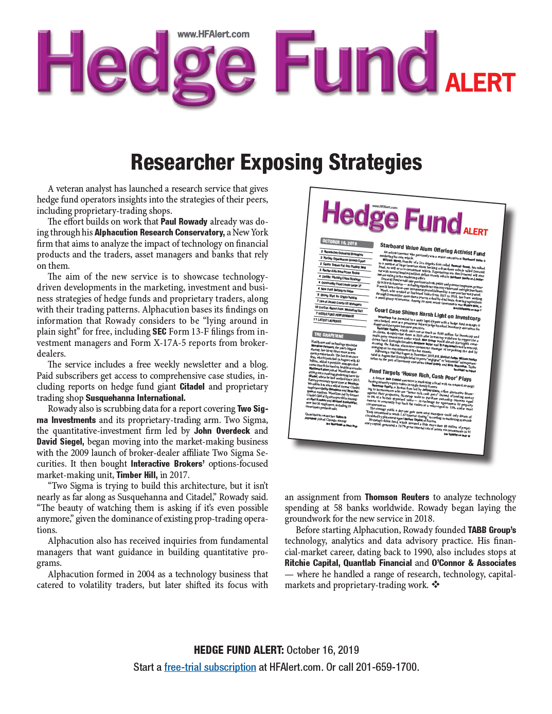 A quick shout out to Howard Kapiloff for assembling the piece on Alphacution that went out today in the latest edition of Hedge Fund Alert. Thankfully, those who operate closest to the sources of liquidity know this work well. But, those who operate at some distance from the sources of liquidity and still realize that the impacts we are quantifying and illustrating here are relevant to them speaks volumes about their eye for something new that might matter.