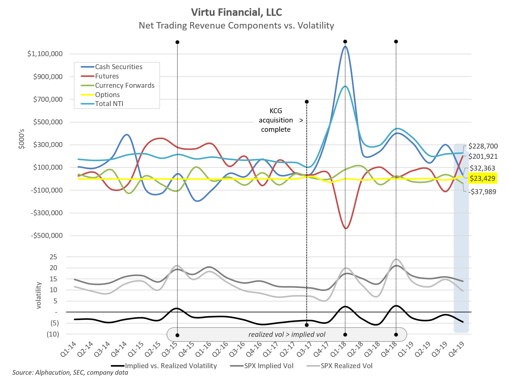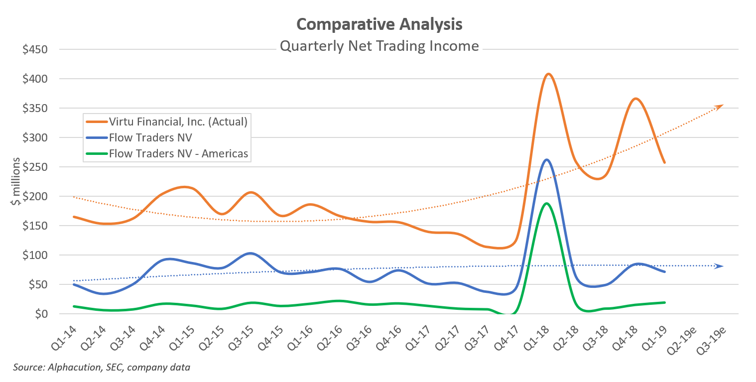 In a recent Feed post updating the components of net trading income (NTI) for Virtu, we presented the following chart. The purpose of presenting it again, here, is not so much to re-emphasize Virtu’s historical performance, but to illustrate the relationship between performance and volatility in a way that can’t be done for many other firms in this area of the ecosystem, save for Flow Traders (second chart below). These are examples of surprise spikes in volatility – when realized vol exceeds implied vol, like in Q1 2018 (based on a few high-vol days in early Feb of that year) – where automated, high-frequency market making programs tend to do well…