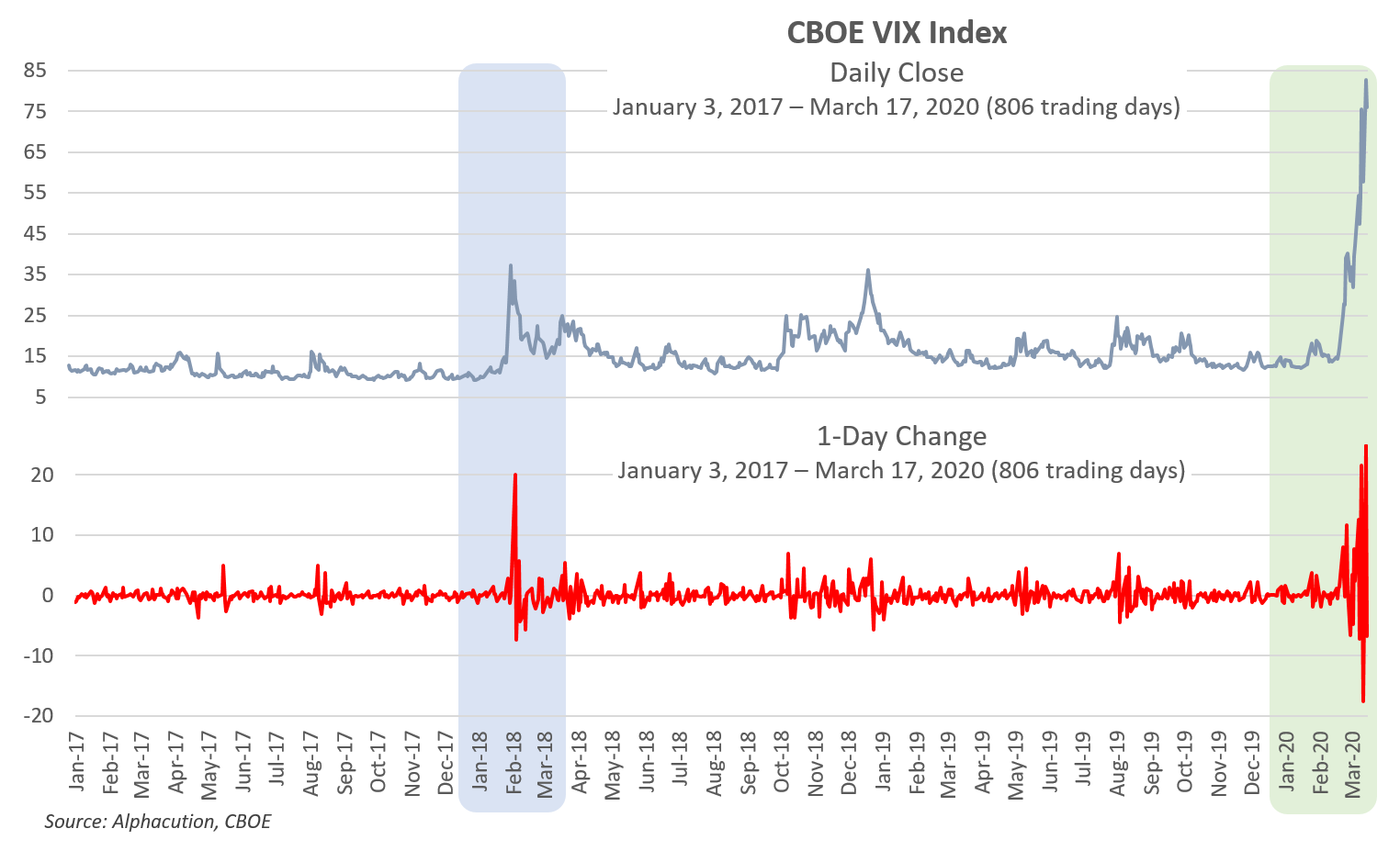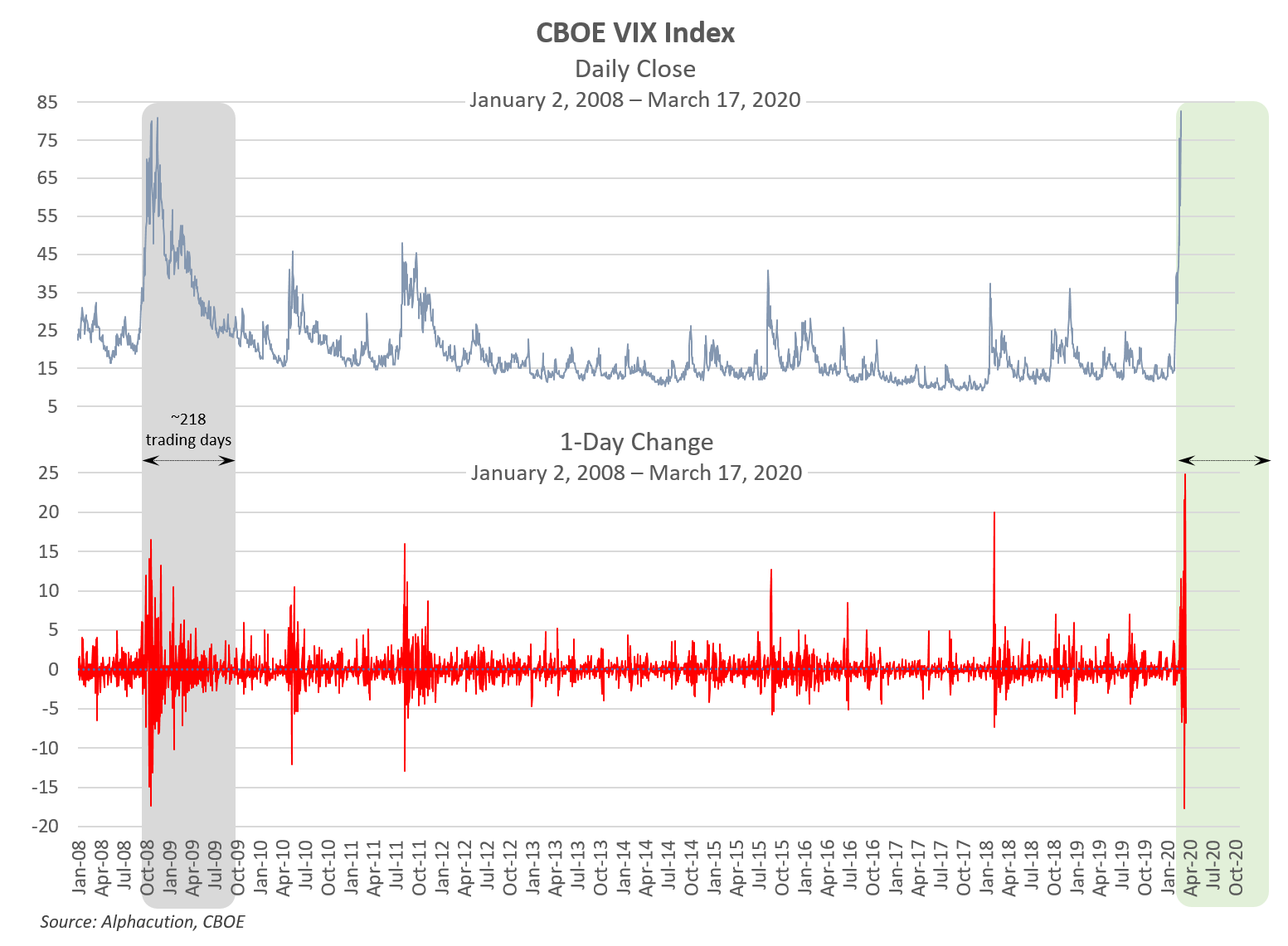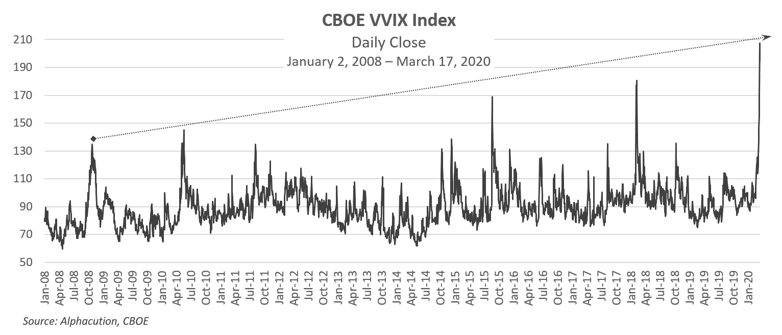 Moreover, the bottom chart – a time series of 1-day changes in daily VIX closes – truly illustrates the earthquake-like reaction the market has had to the CVP flow of news relative to other turbulent periods of the GFC era. In fact, the all-time-high volatility of volatility index (VVIX) reading for March 2020, below, makes ~October 2008 look more like a foothill…