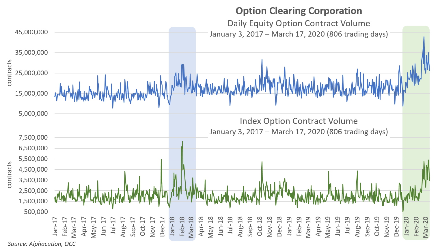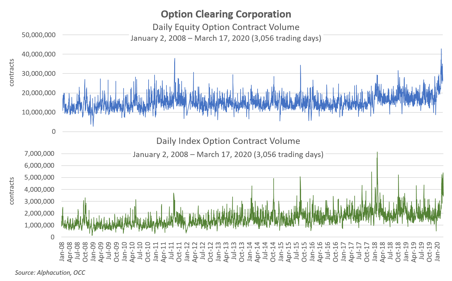 With that prelude as backdrop, I figured a visual look into the option market and volatility levels today relative to 2008 would prove a useful benchmarking exercise for our readers, starting here thanks to our friends at Option Clearing Corp. (OCC): In the chart, below, Alphacution presents 3,056 trading days (Jan 2, 2008 – Mar 17, 2020) of daily equity and index option contract volumes for all US options exchanges that covers the 2008-2009 Global Financial Crisis (GFC) and the emerging Coronavirus Pandemic (CVP).