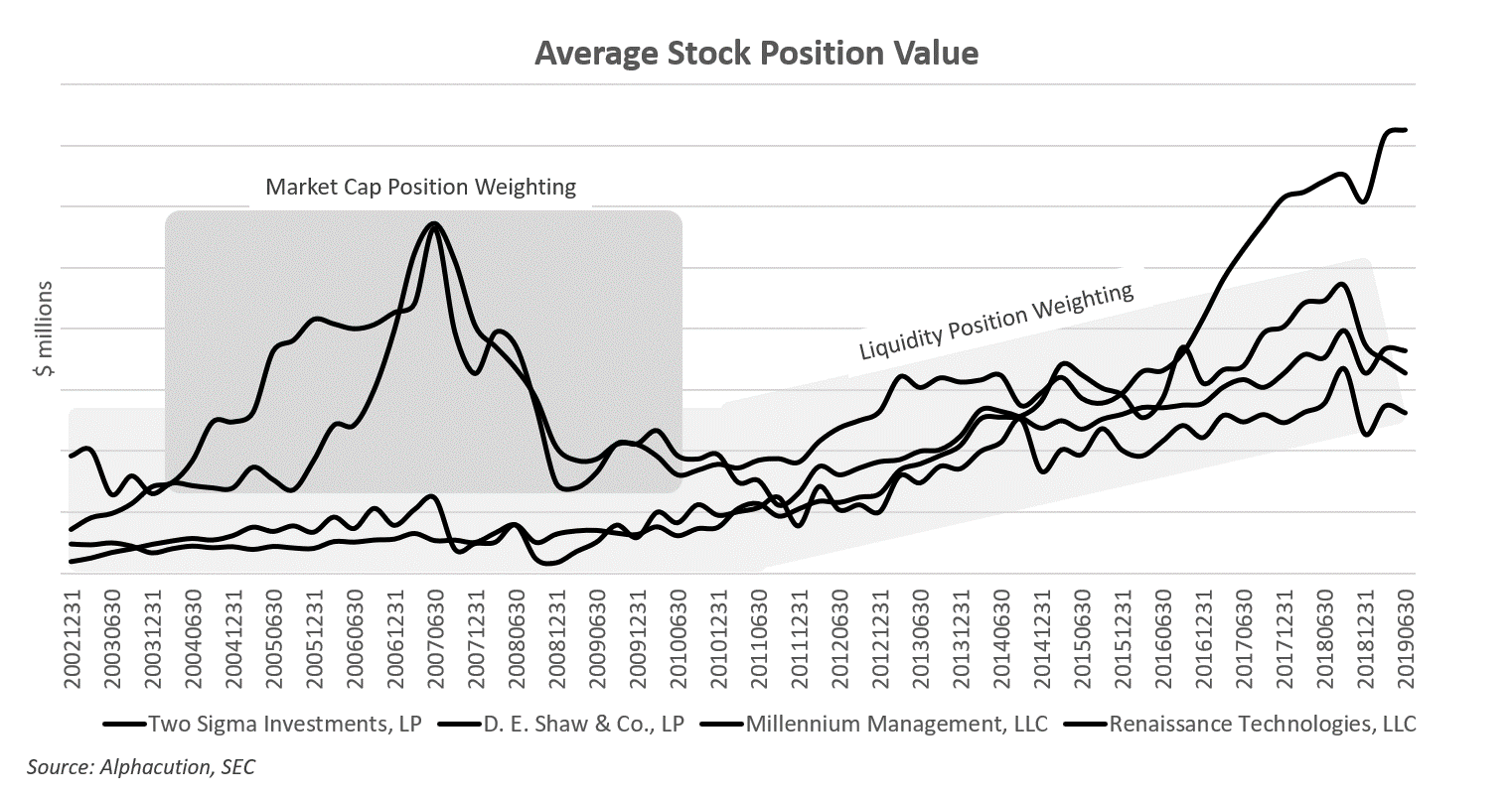 In the chart below, Alphacution presents the average stock position by value for the 67-quarter period beginning Q4 2002 and ending Q2 2019 for the four legendary quant managers, Renaissance Technologies, Millennium Management, D. E. Shaw & Co., and Two Sigma Investments.