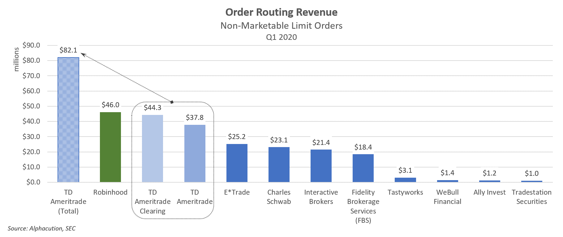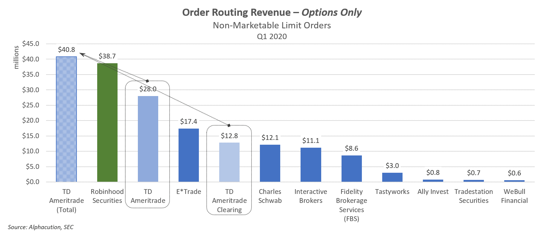 There are 4 categories of order types and 3 categories of products in the new 606 reports, which means that there are (potentially) 12 order type-product revenue pairs for each retailer of order flow. And, of the 12 order type-product pairs for Robinhood, non-marketable limit orders in options represent the largest category of order flow revenue. Not only that, at #2 amongst its peers, this category for Robinhood is within $2 million of being equivalent to the same option NMLO category for the combined version of (the much larger by client assets) TD Ameritrade as of Q1 2020. In other words, Robinhood is close to being the #1 largest player in the ecosystem by this measure: