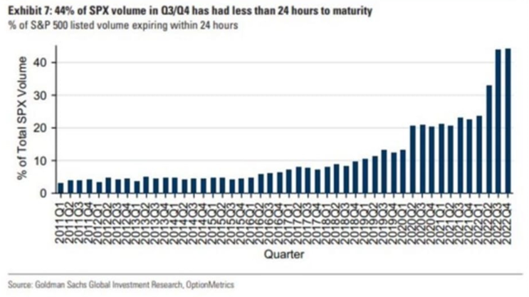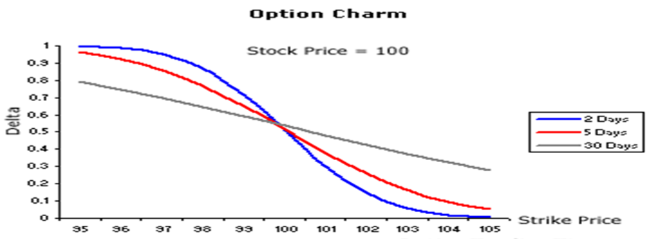 The option market refers to the dynamics of this delta shift over time with the harmless sounding term “charm.” Charm has become a much bigger and more frequent market impact factor in recent years as the focus of traded options have migrated to shorter dated exposures. See below: