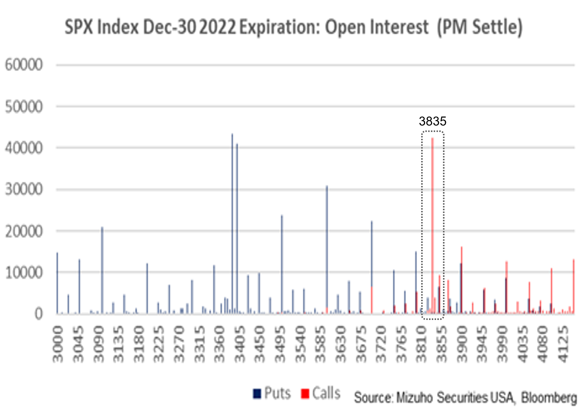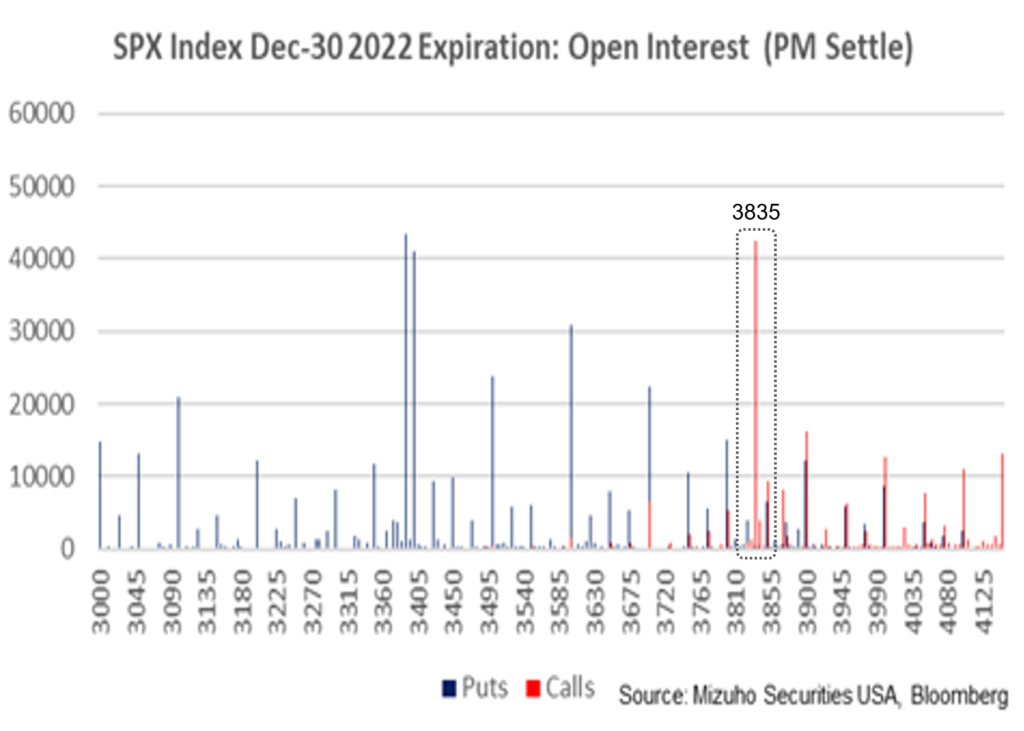 Note the disproportionately large open interest on the 3835 strike calls versus all other strikes near our current market level (~3896 close, as of December 15, 2022), below:
