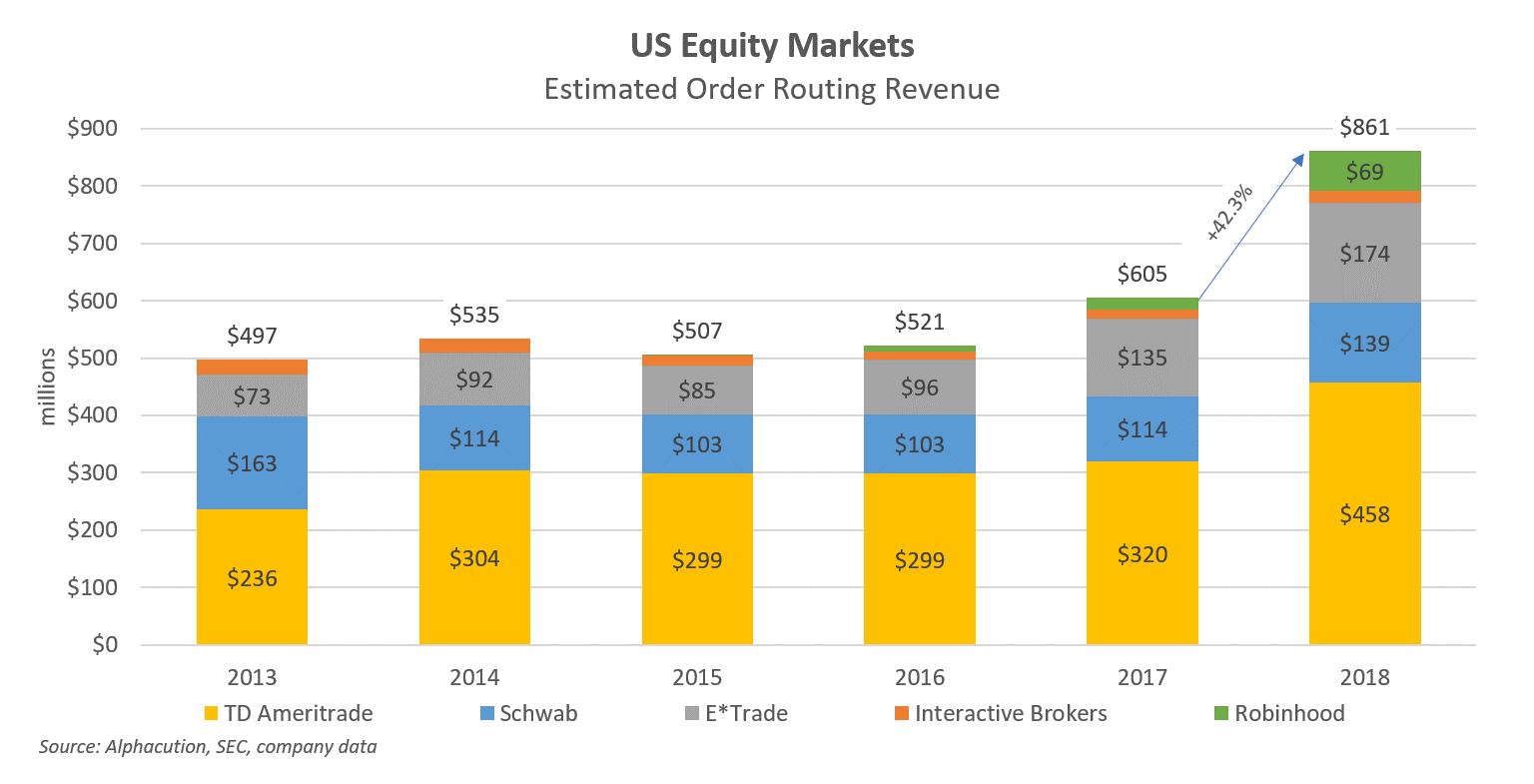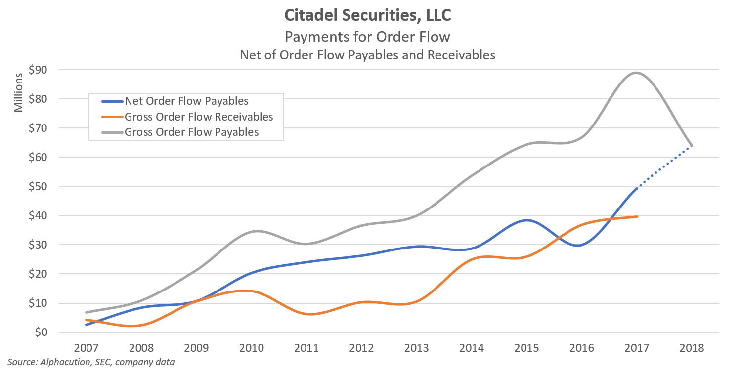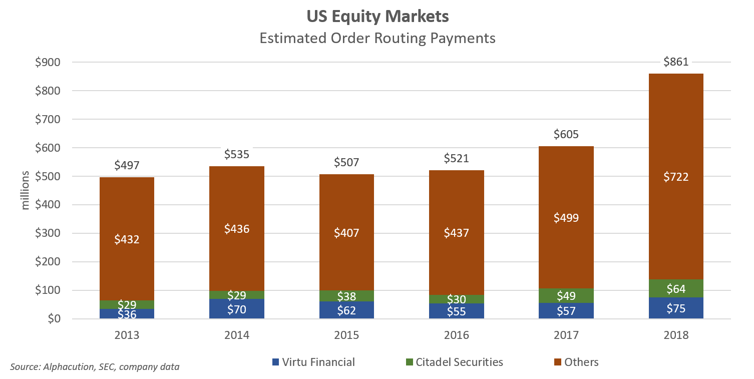 Symbolic of this idea, the following charts are Alphacution’s assembly of data on payments for order flow (PFOF) – some of which that were originally published in “Robinhood: Payments for Order Flow 2018, Up 227%” – without further comment: